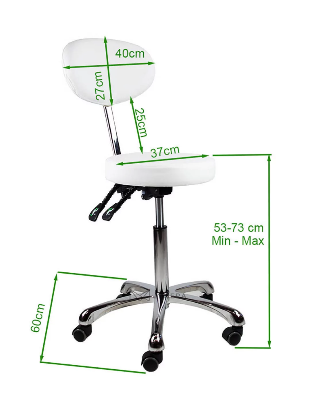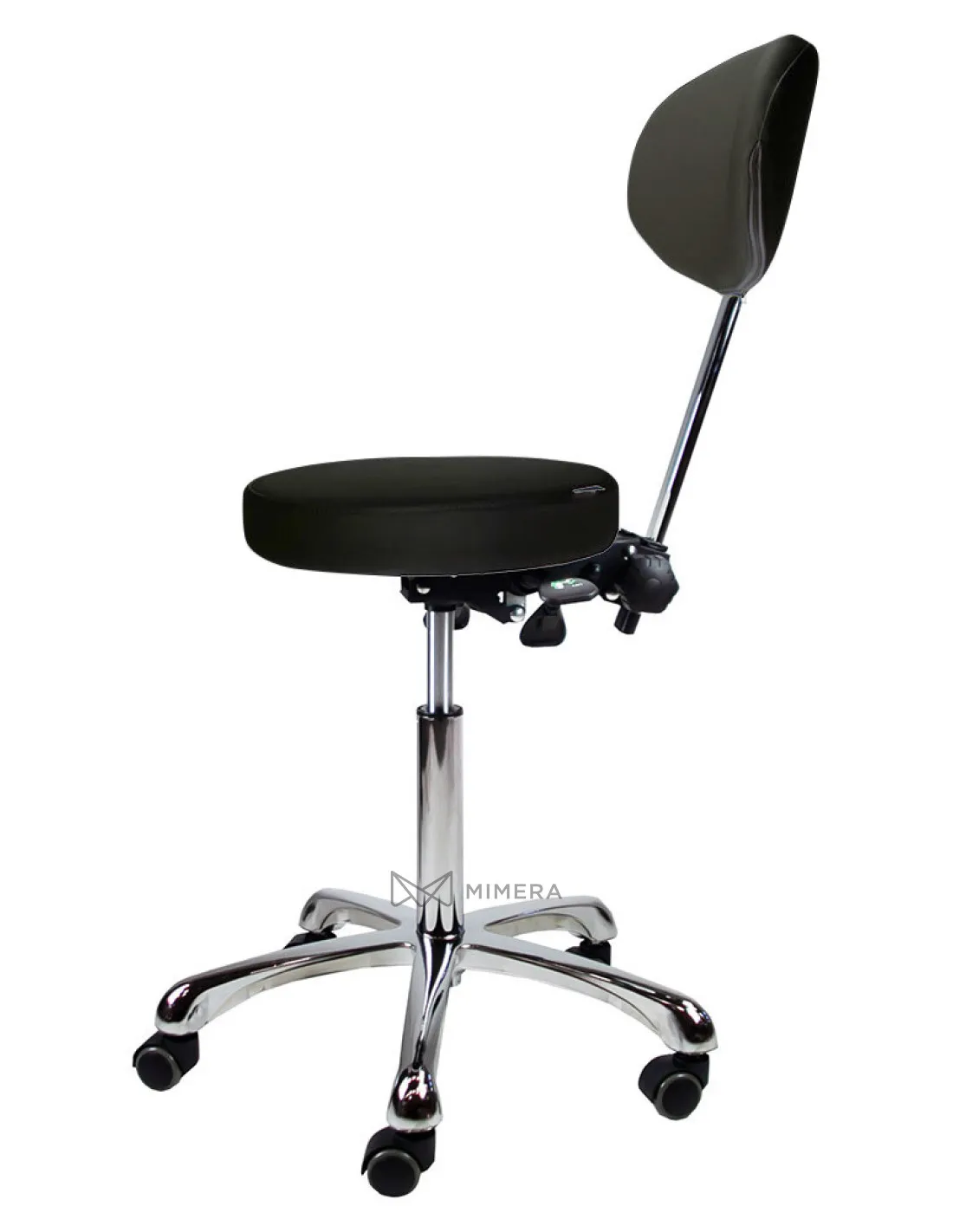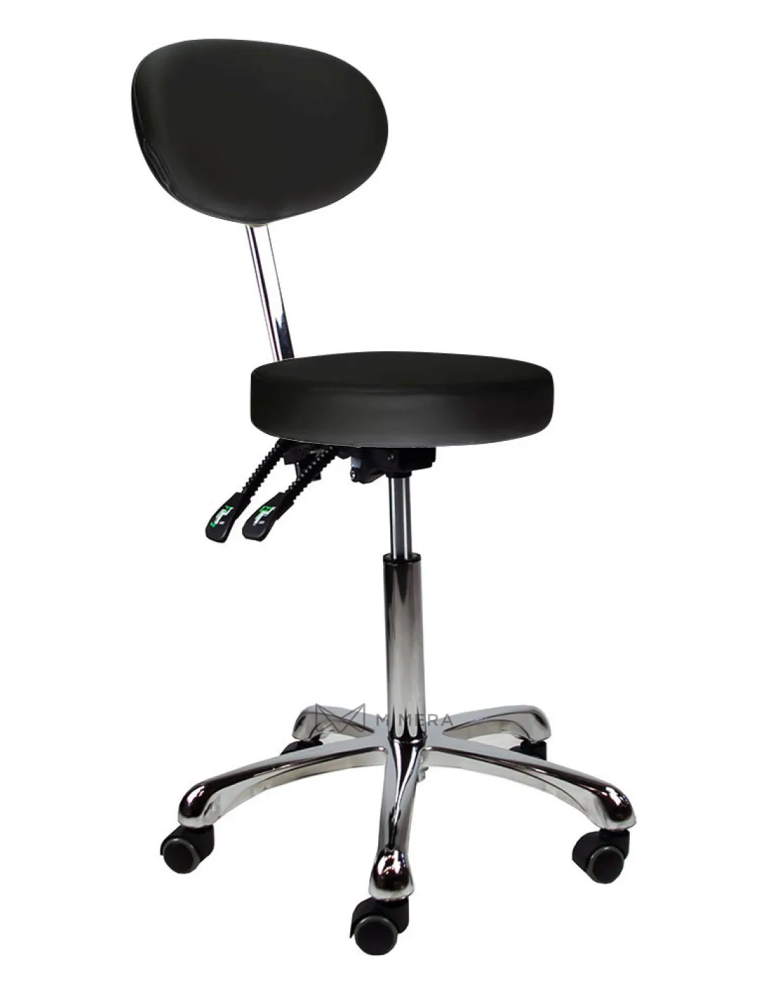 Höhe, Sitz und Neigung der Rückenlehne lassen sich mit drei Handhebeln unter dem Sitz stufenlos verstellen. Die hochwertige PU-Polsterung ist leicht zu reinigen und das verchromte Untergestell ist mit fünf Rollen ausgestattet, die eine bequeme Arbeitsposition ermöglichen.