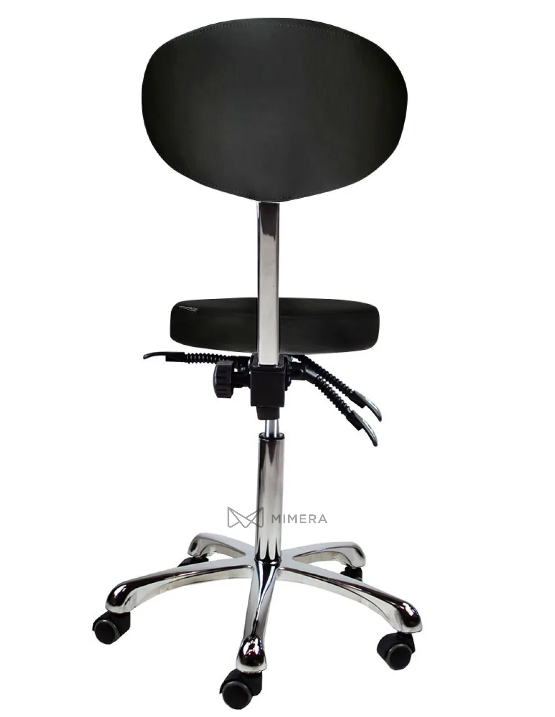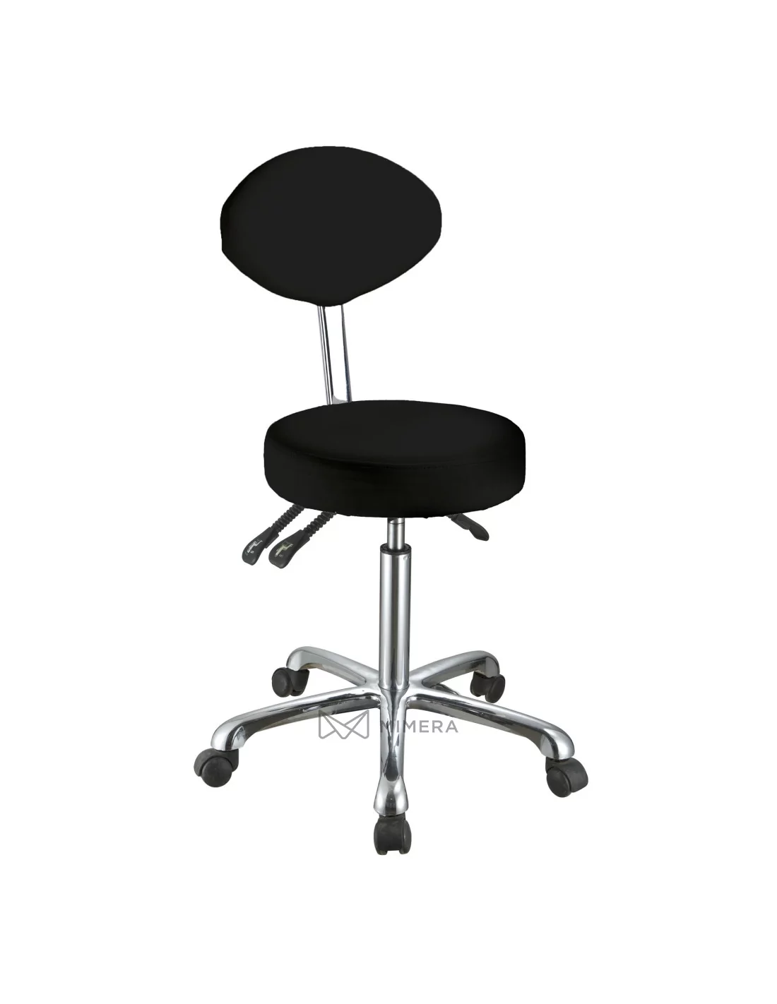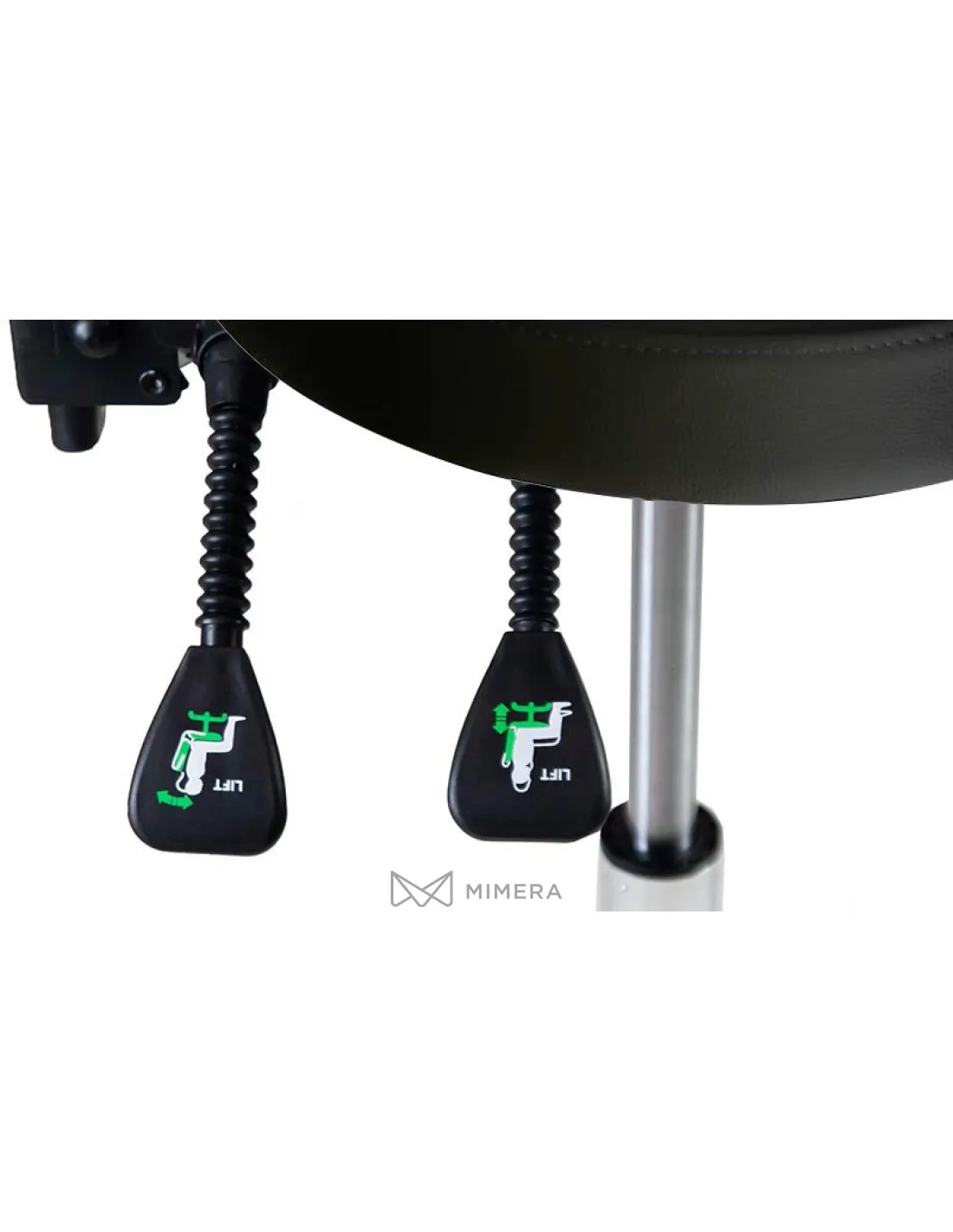 Höhe, Sitz und Neigung der Rückenlehne lassen sich mit drei Handhebeln unter dem Sitz stufenlos verstellen. Die hochwertige PU-Polsterung ist leicht zu reinigen und das verchromte Untergestell ist mit fünf Rollen ausgestattet, die eine bequeme Arbeitsposition ermöglichen.