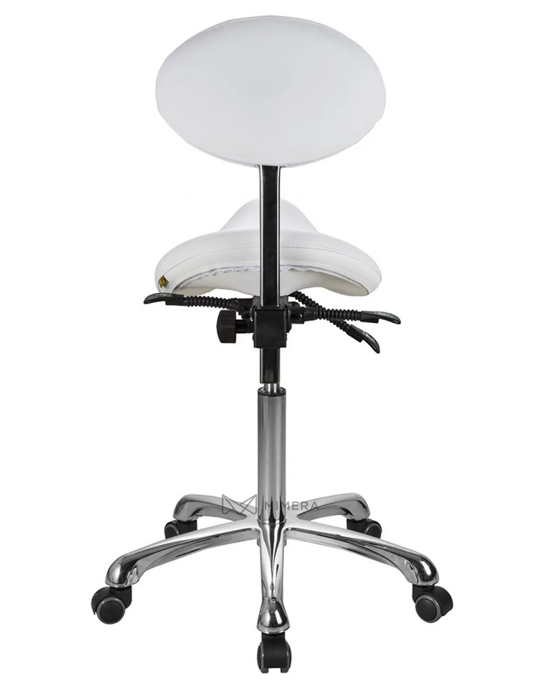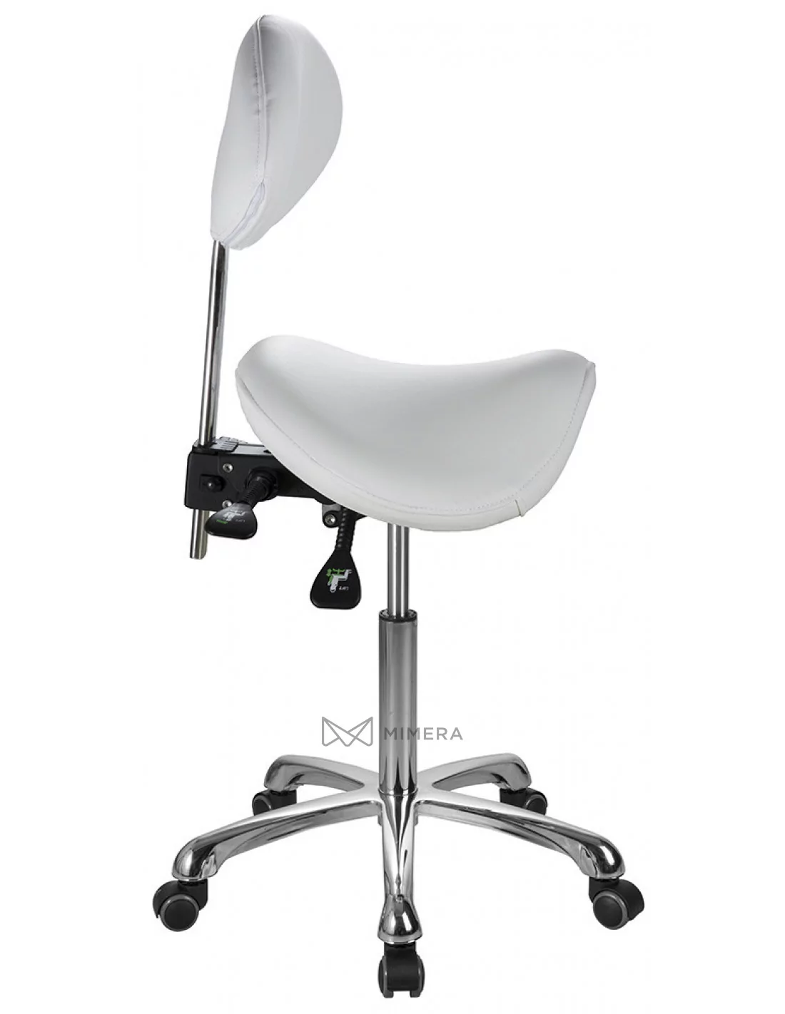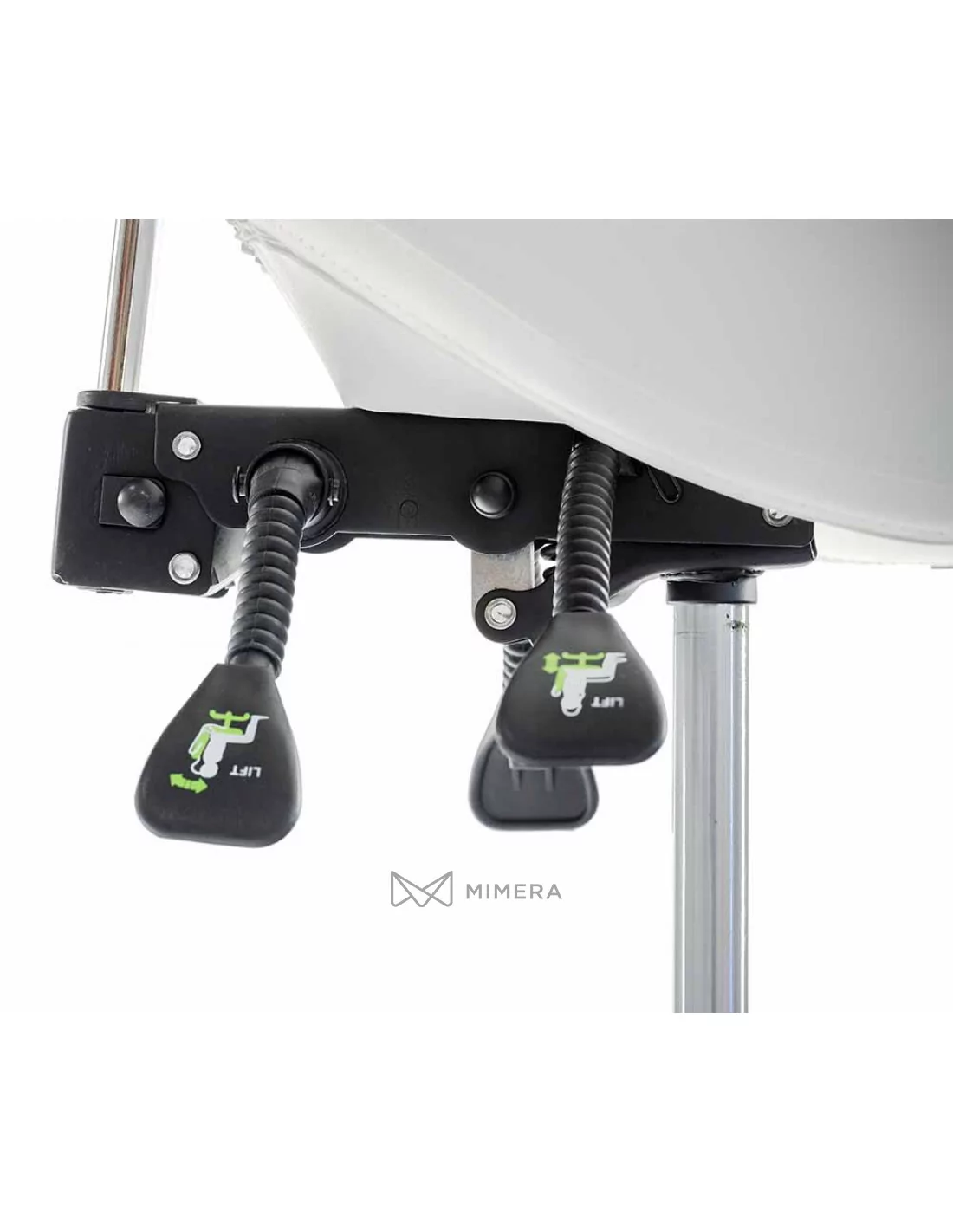 Die Höhe, Neigung des Sitzes und der Rückenlehne lassen sich stufenlos über drei Handhebel unter dem Sitz einstellen. Die hochwertige PU-Polsterung ist leicht zu reinigen, und das verchromte Fußkreuz mit fünf Rollen erleichtert das Finden einer bequemen Arbeitsposition.