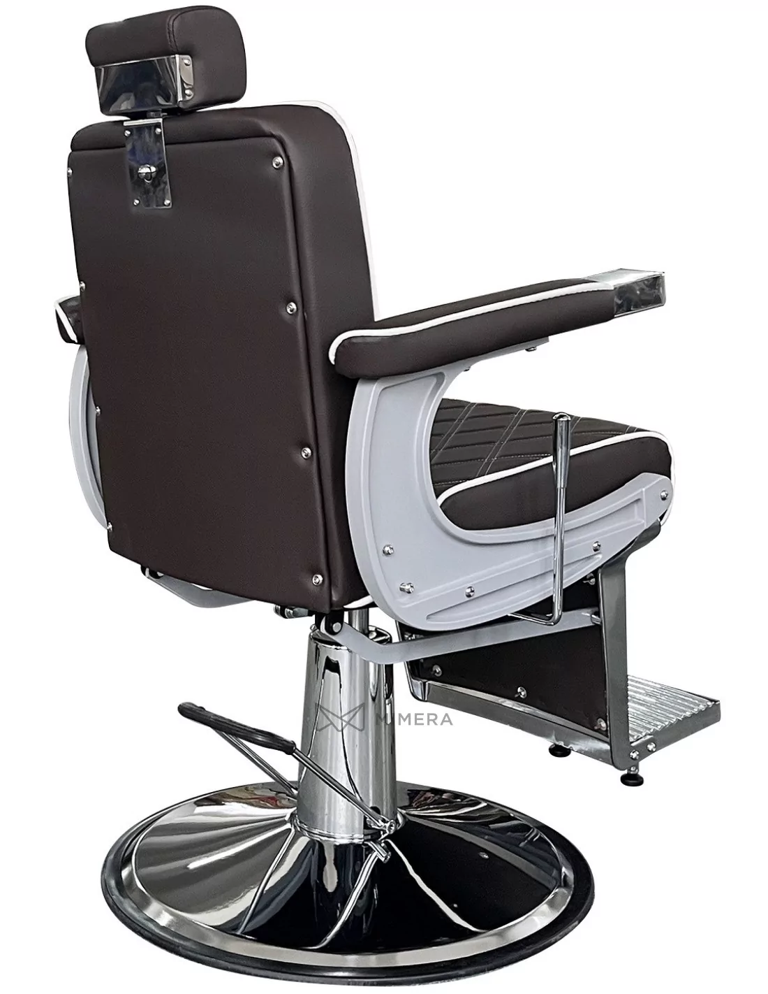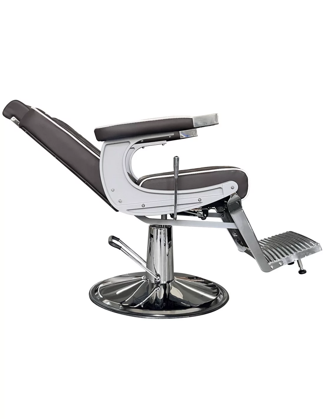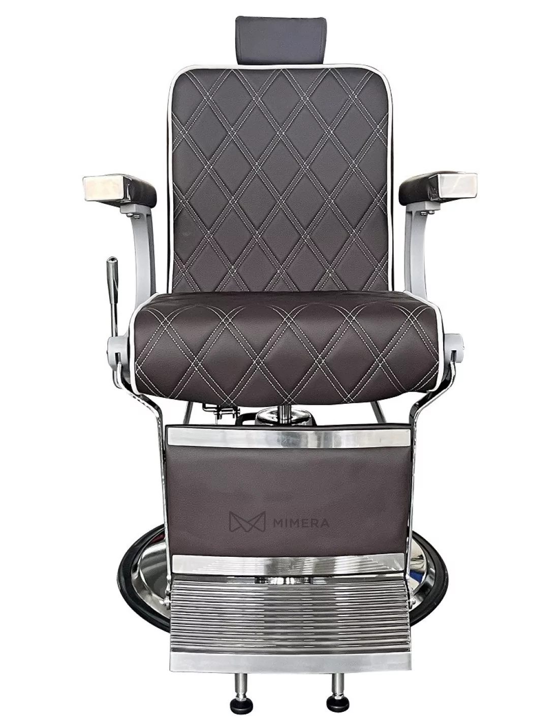 Der moderne Barberstuhl CROSS besticht durch seine einzigartige taupe-braune Farbe und die dreifache Kombination aus "X"-förmig gesteppter Polsterung, glänzender und matten Metallkonstruktion und industriellem Style.
