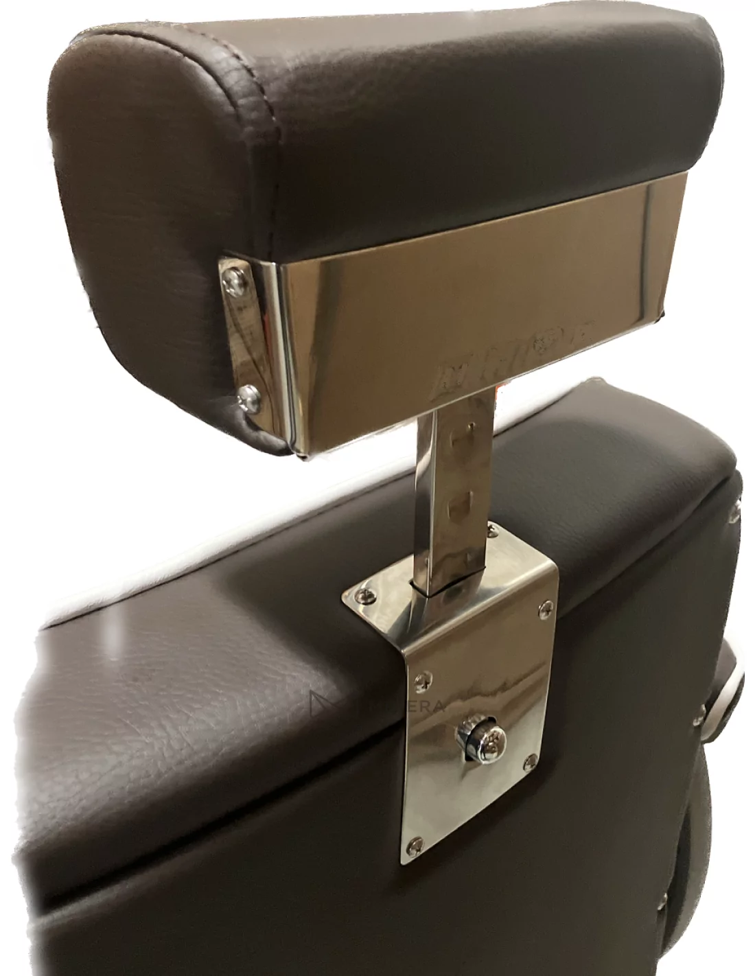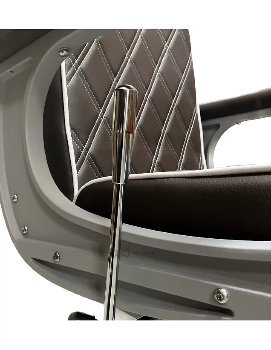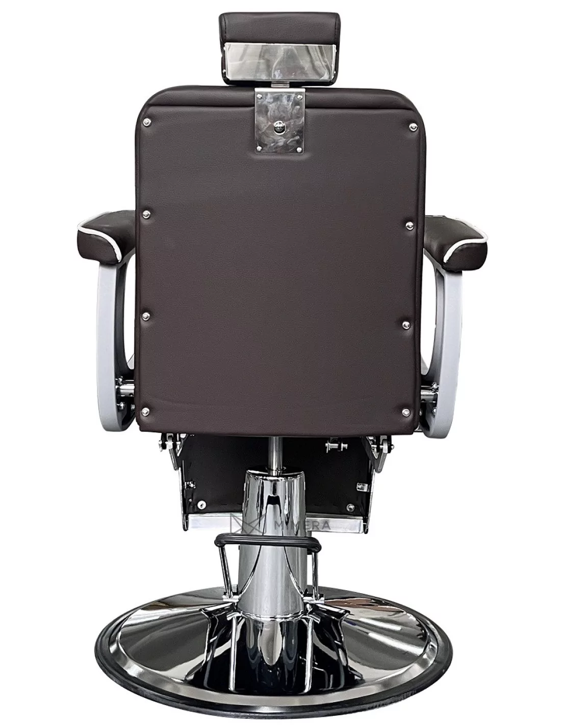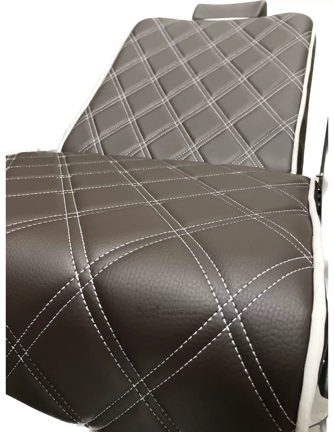 Der moderne Barberstuhl CROSS besticht durch seine einzigartige taupe-braune Farbe und die dreifache Kombination aus "X"-förmig gesteppter Polsterung, glänzender und matten Metallkonstruktion und industriellem Style.