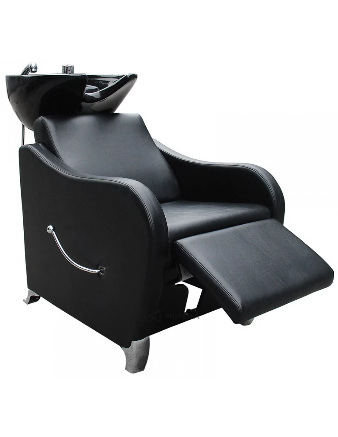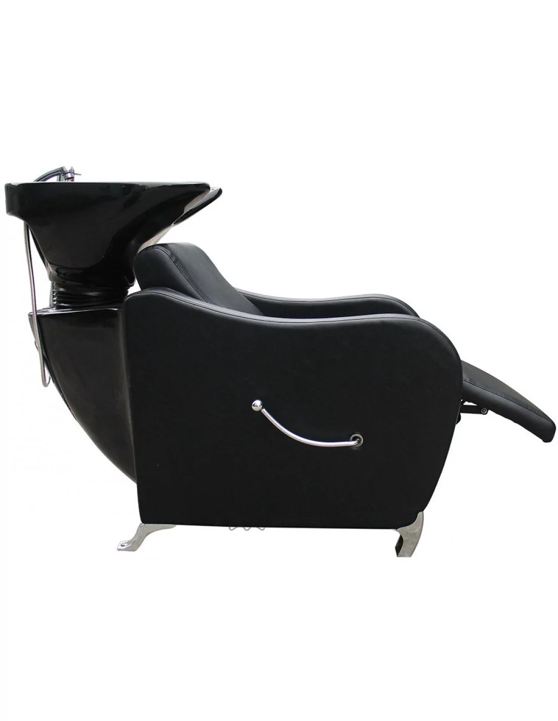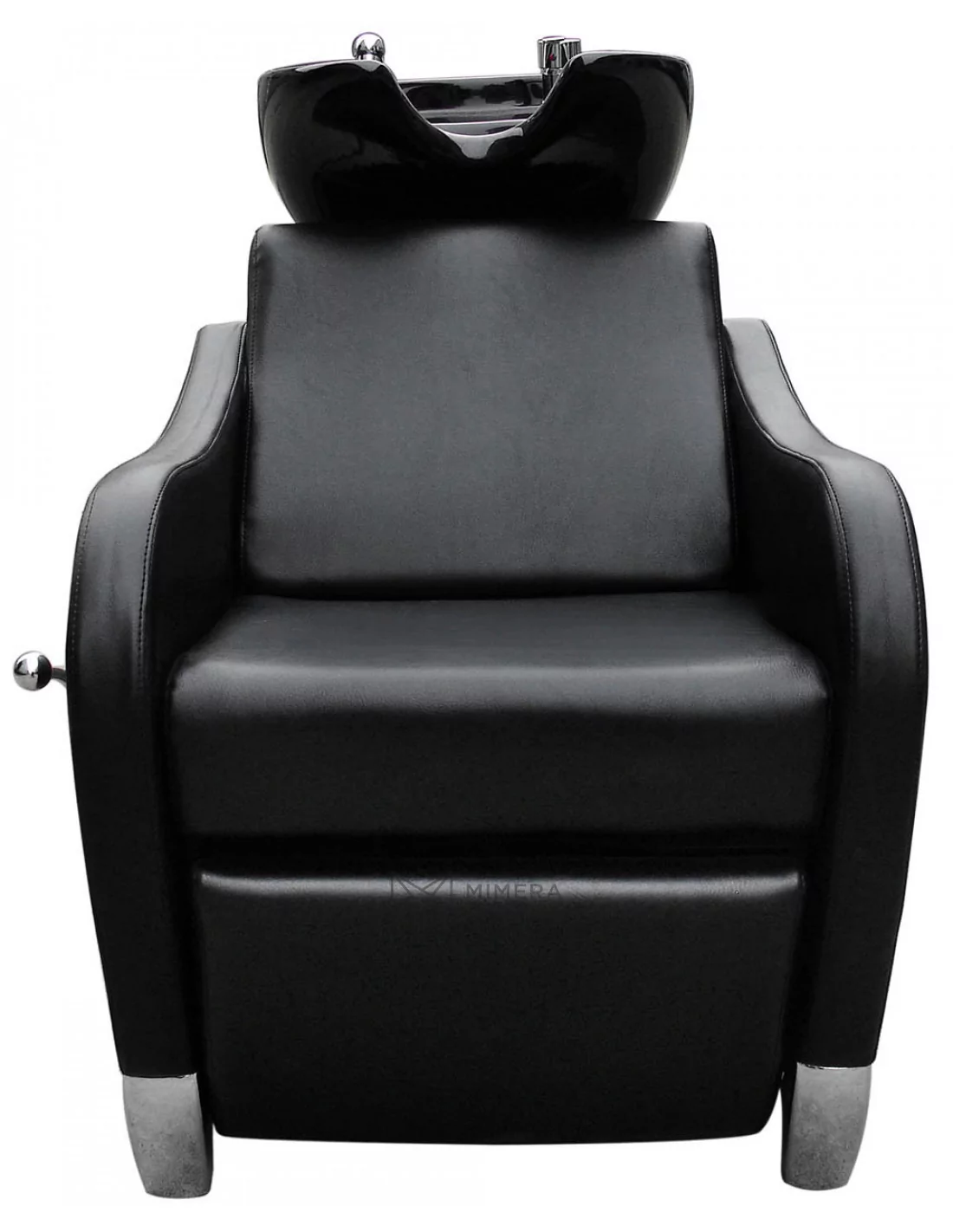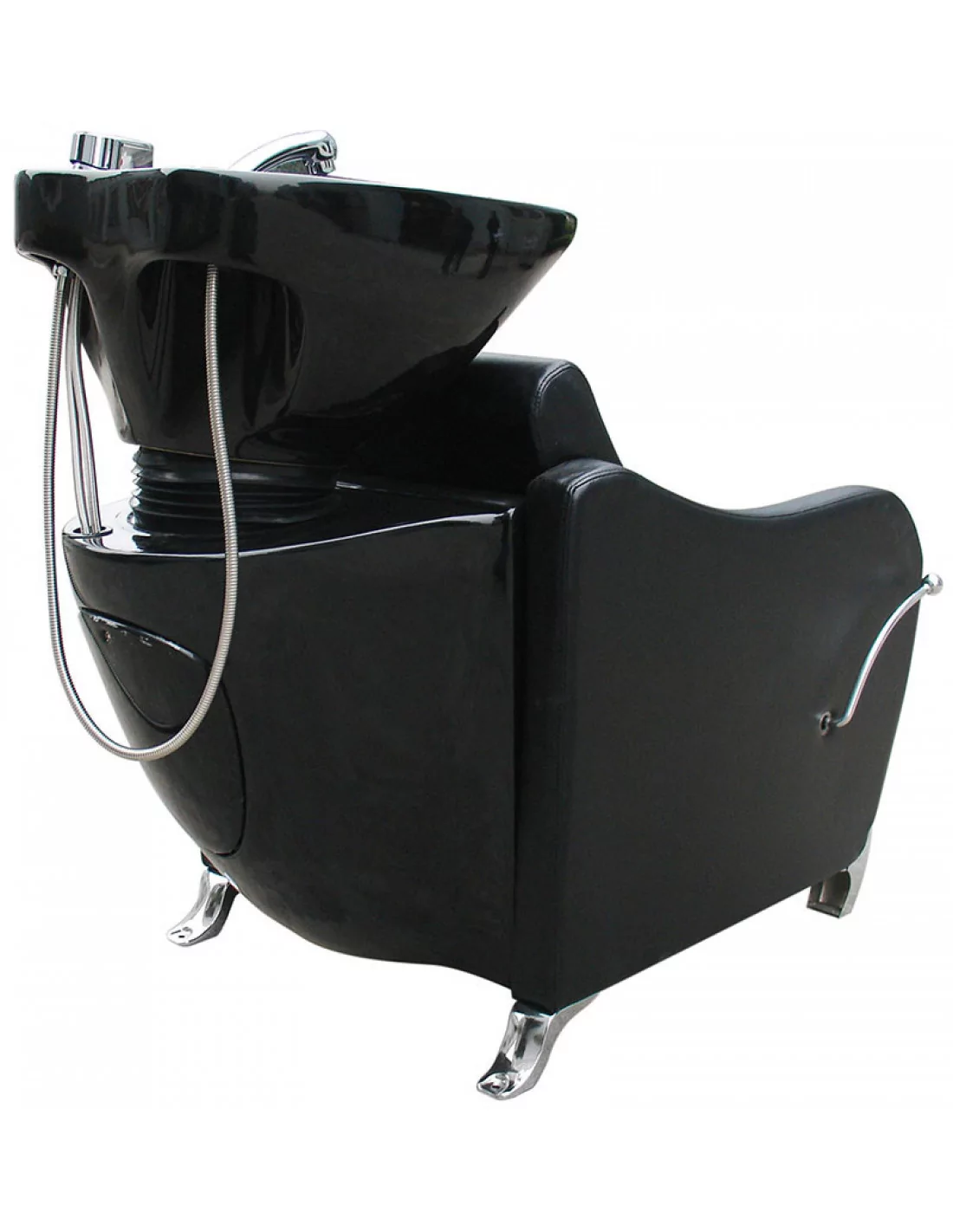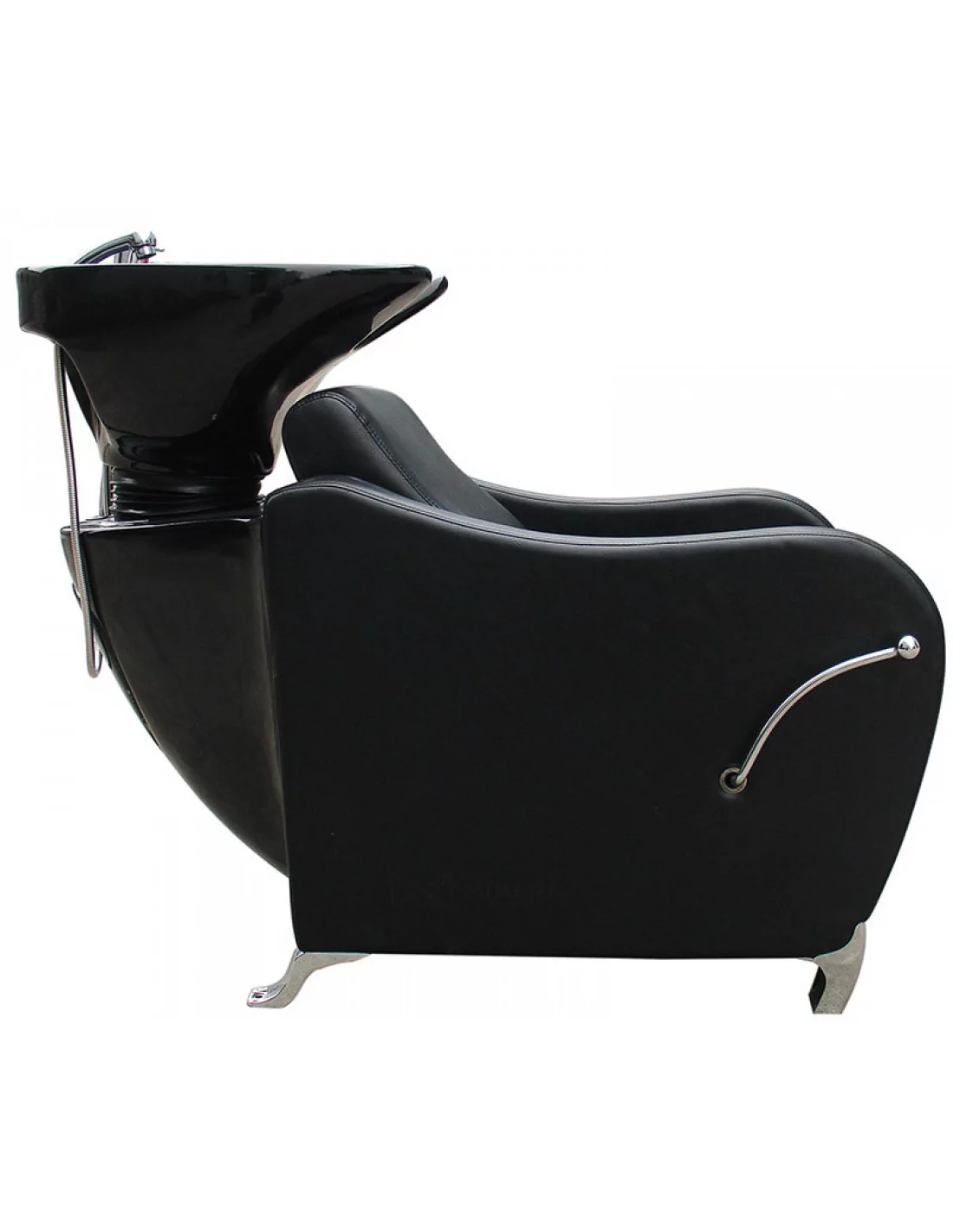 Eine komfortable Wascheinheit in robuster Ausführung mit einem tiefen Keramik-Waschbecken, Metallstuhlbeinen und gepolsterten Armlehnen. Ideal für jeden professionellen Barber oder Friseursalon.