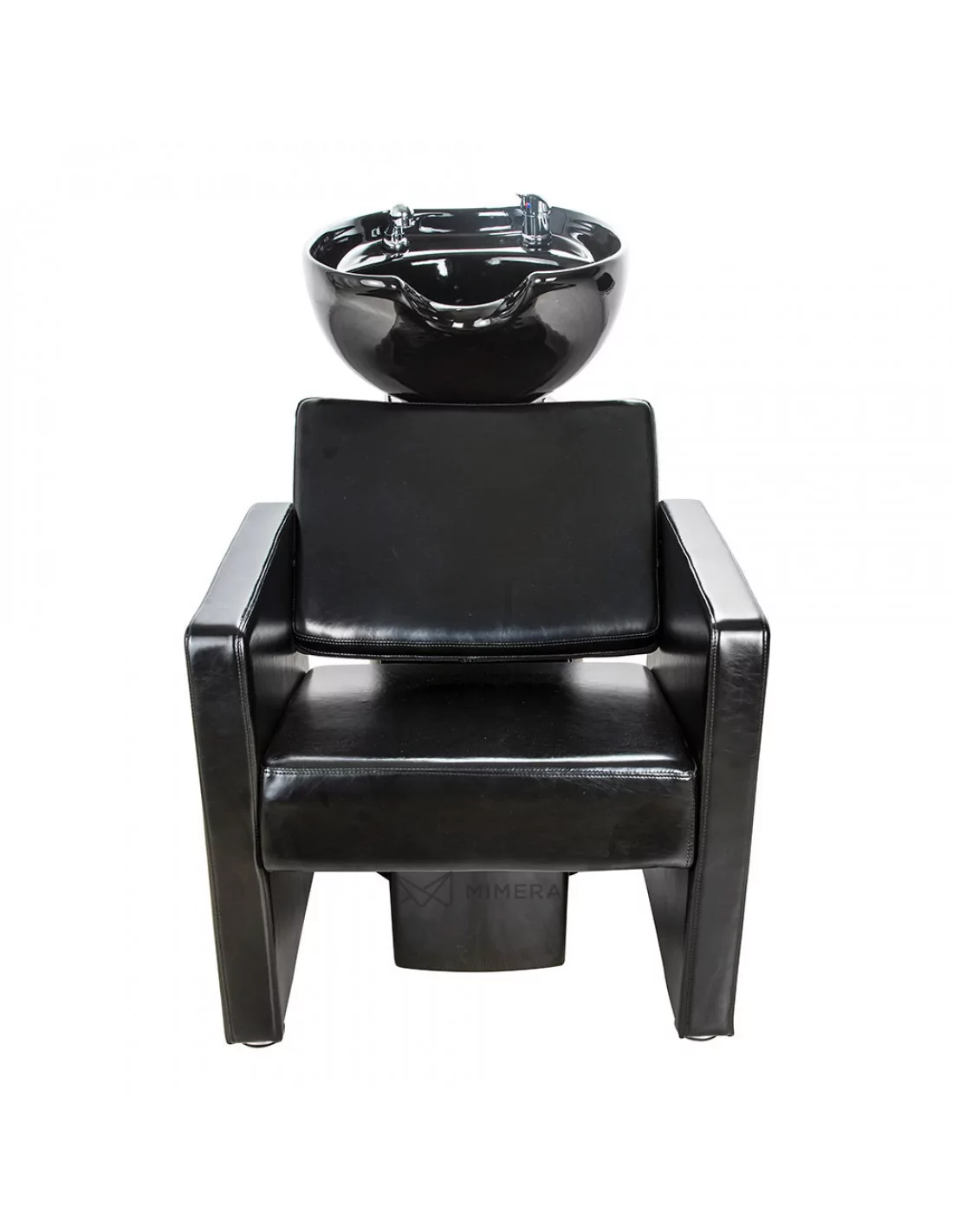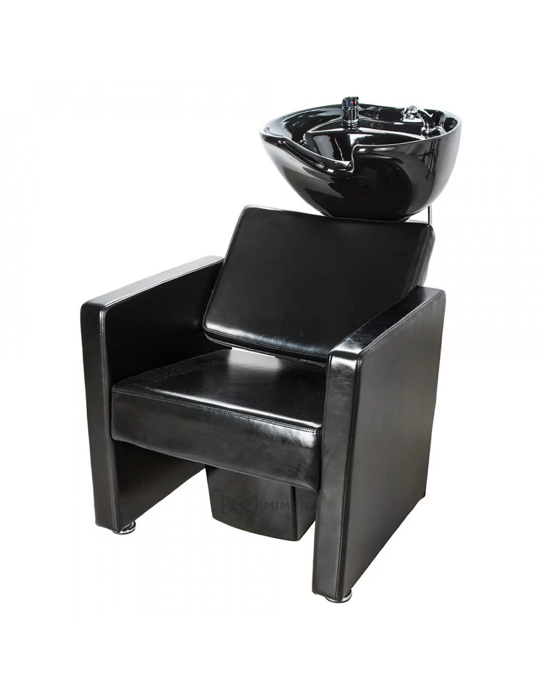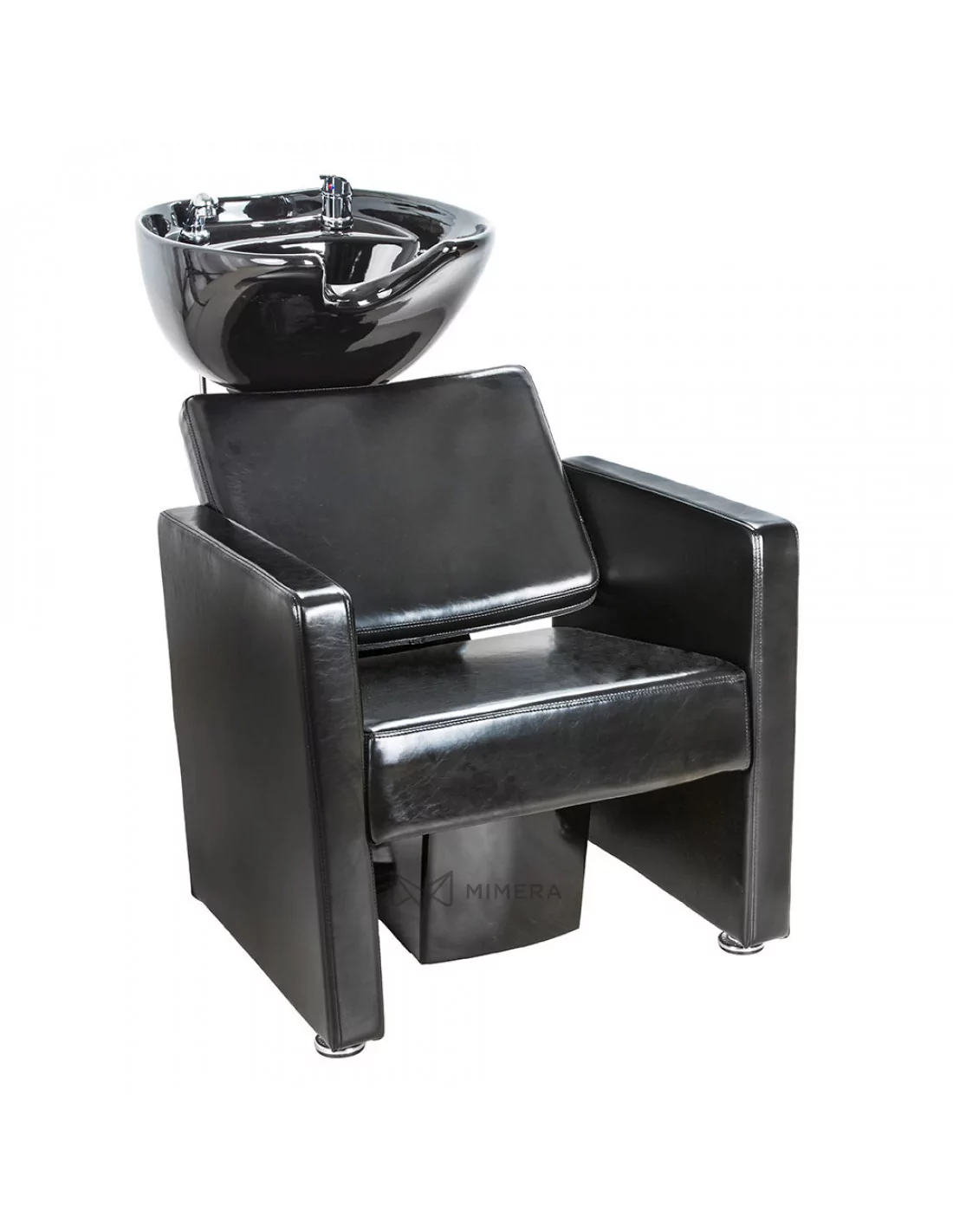 Hochwertiges Porzellanwaschbecken mit komfortablem Polstersessel für ein professionelles Arbeiten.