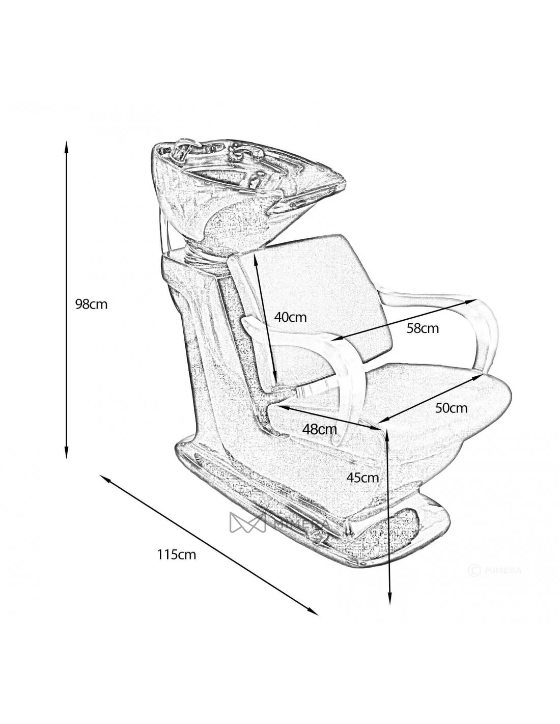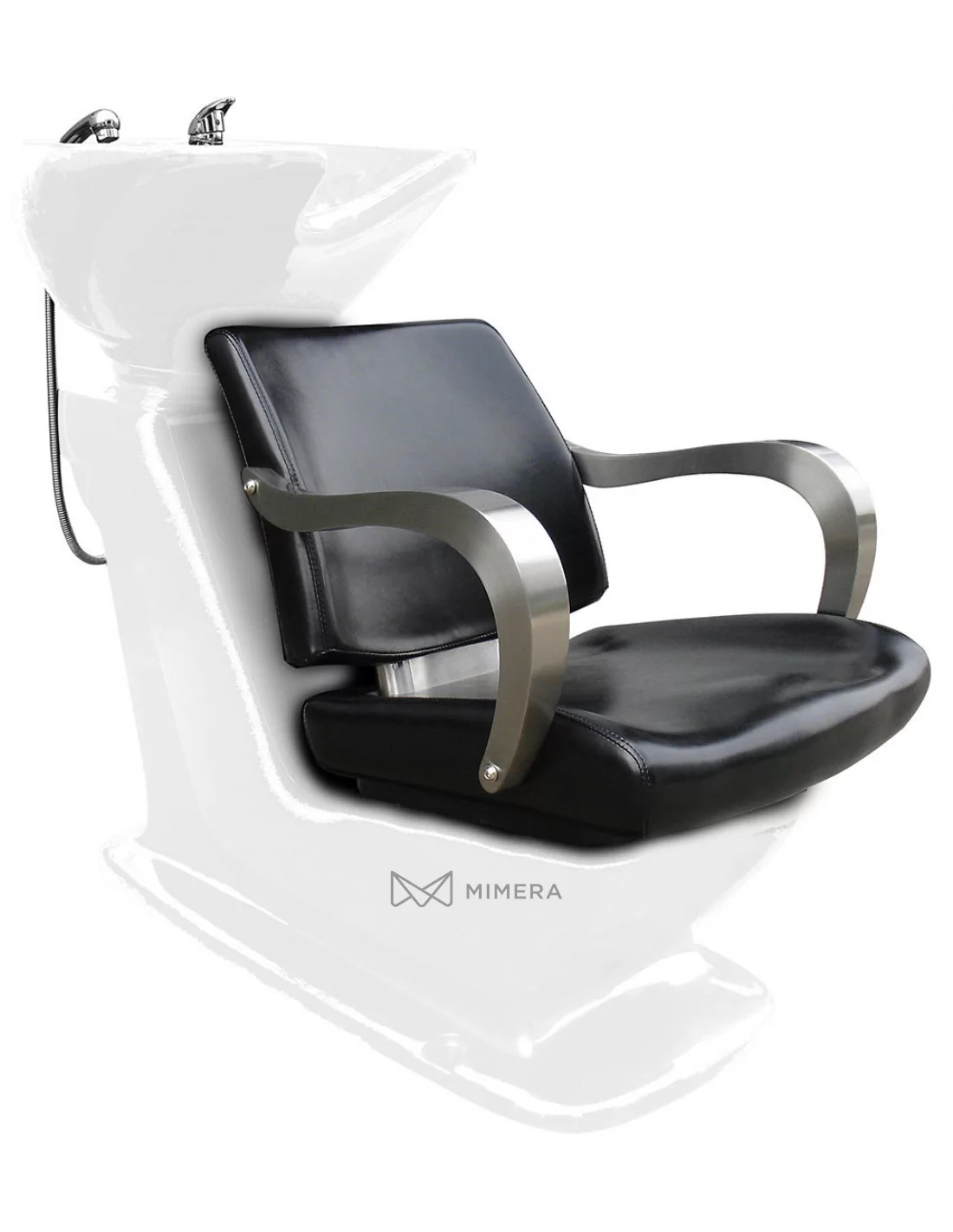 Moderne Waschanlage mit einem einfachen aber stilvollen Design. Verfügt über verchromte Armlehnen und einen komfortablen matten schwarzen Sitz. Ein stabiler schwarzer Unterschrank unterstützt den Sitz und das Keramik-Waschbecken. Empfehlenswert für jeden professionellen Barber oder Friseursalon.