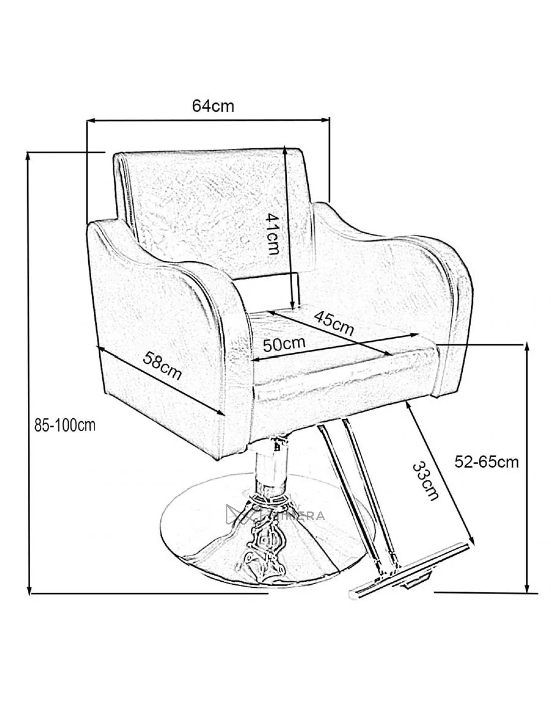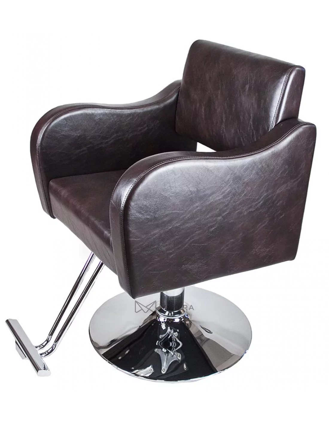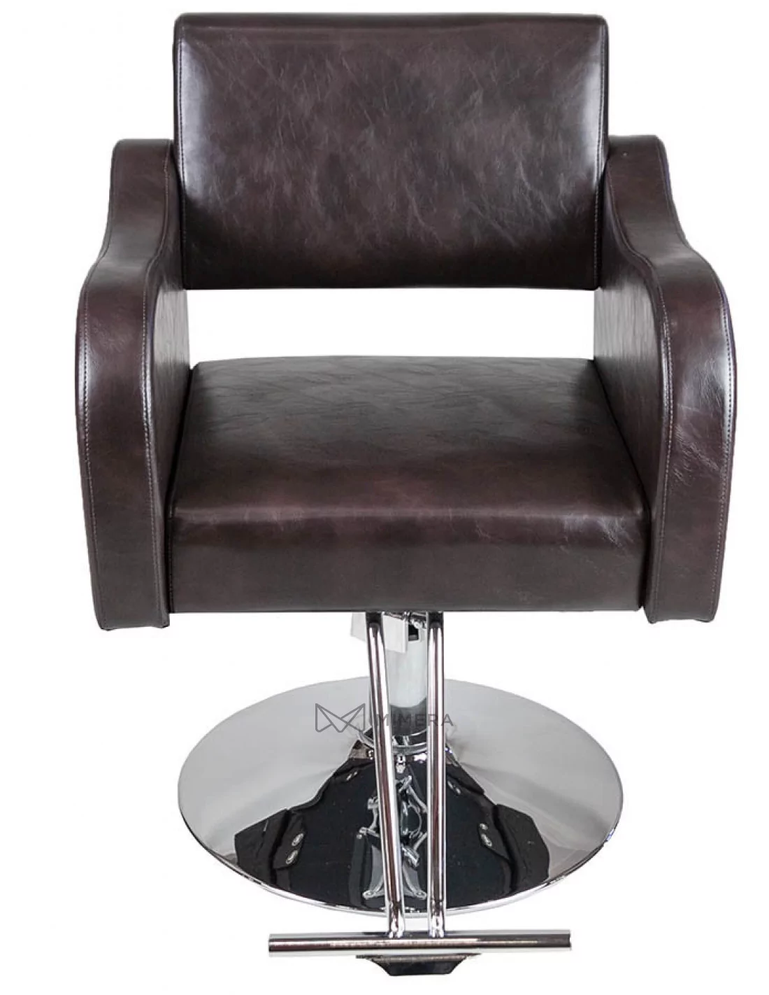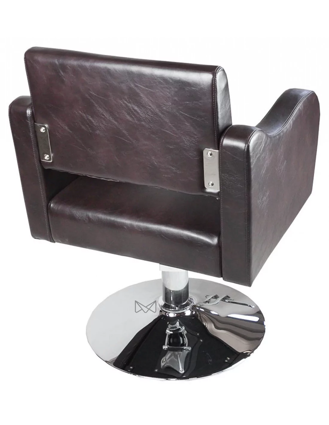 Friseurstuhl in minimalistischem Design mit geformten Armlehnen. Der Spalt zwischen der Rückenlehne und dem Sitz ermöglicht eine einfache Reinigung.