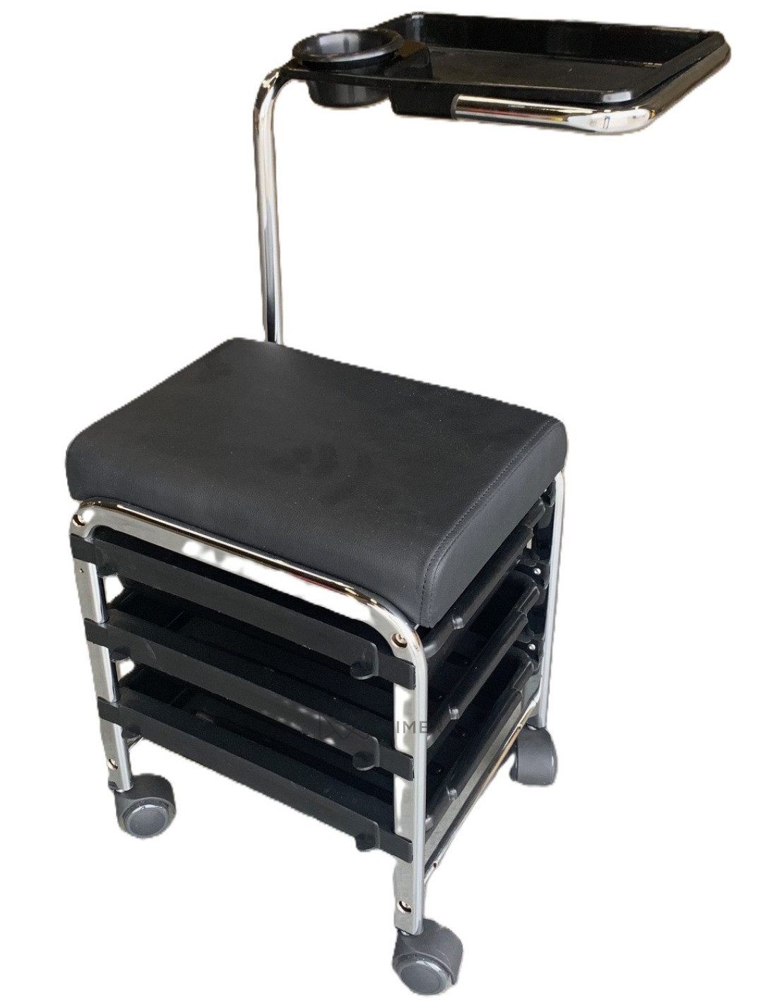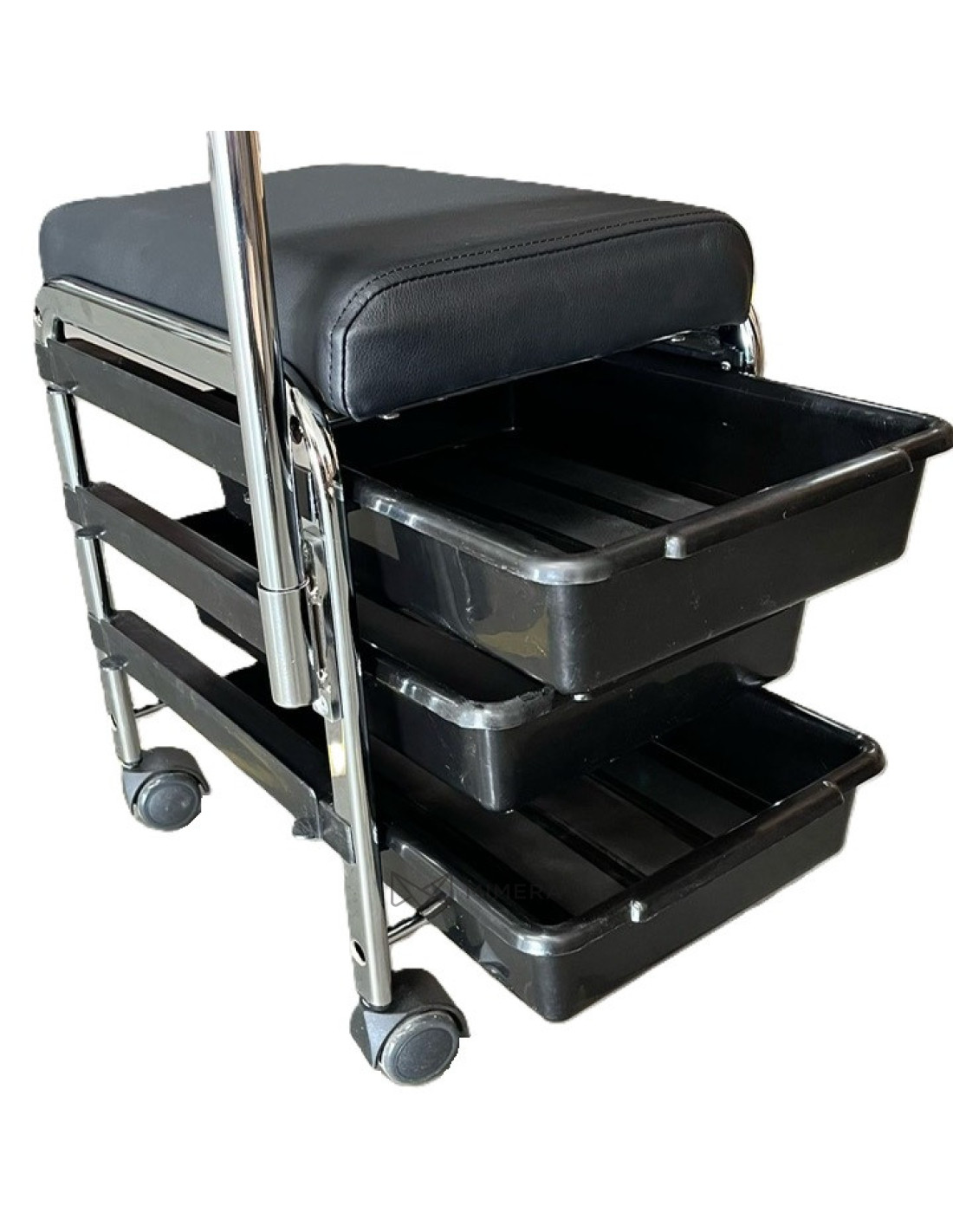 Friseurwagen/Hocker SKIP ist ein praktischer Helfer für jeden Friseursalon, der komfortables Sitzen während kurzer Pausen mit durchdachtem Stauraum verbindet. Unter dem weich gepolsterten Sitz befinden sich drei ausziehbare Schubladen zur Aufbewahrung von Werkzeugen und Zubehör. Der schwenkbare Arm mit Tablett und Farbschale erleichtert das Mischen und Ablegen von Utensilien. Ein ideales Möbelstück für einen gut organisierten und effizienten Salon.
