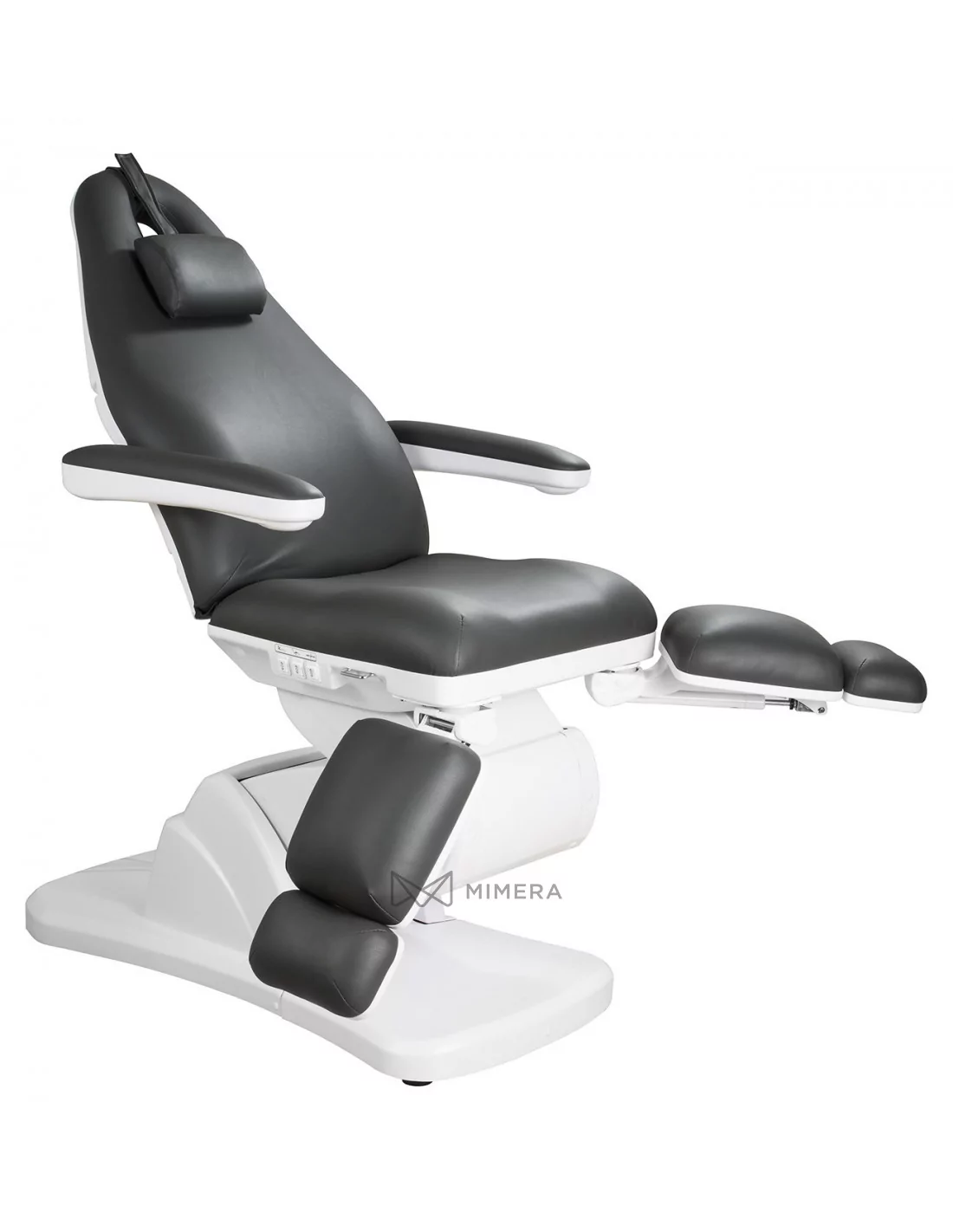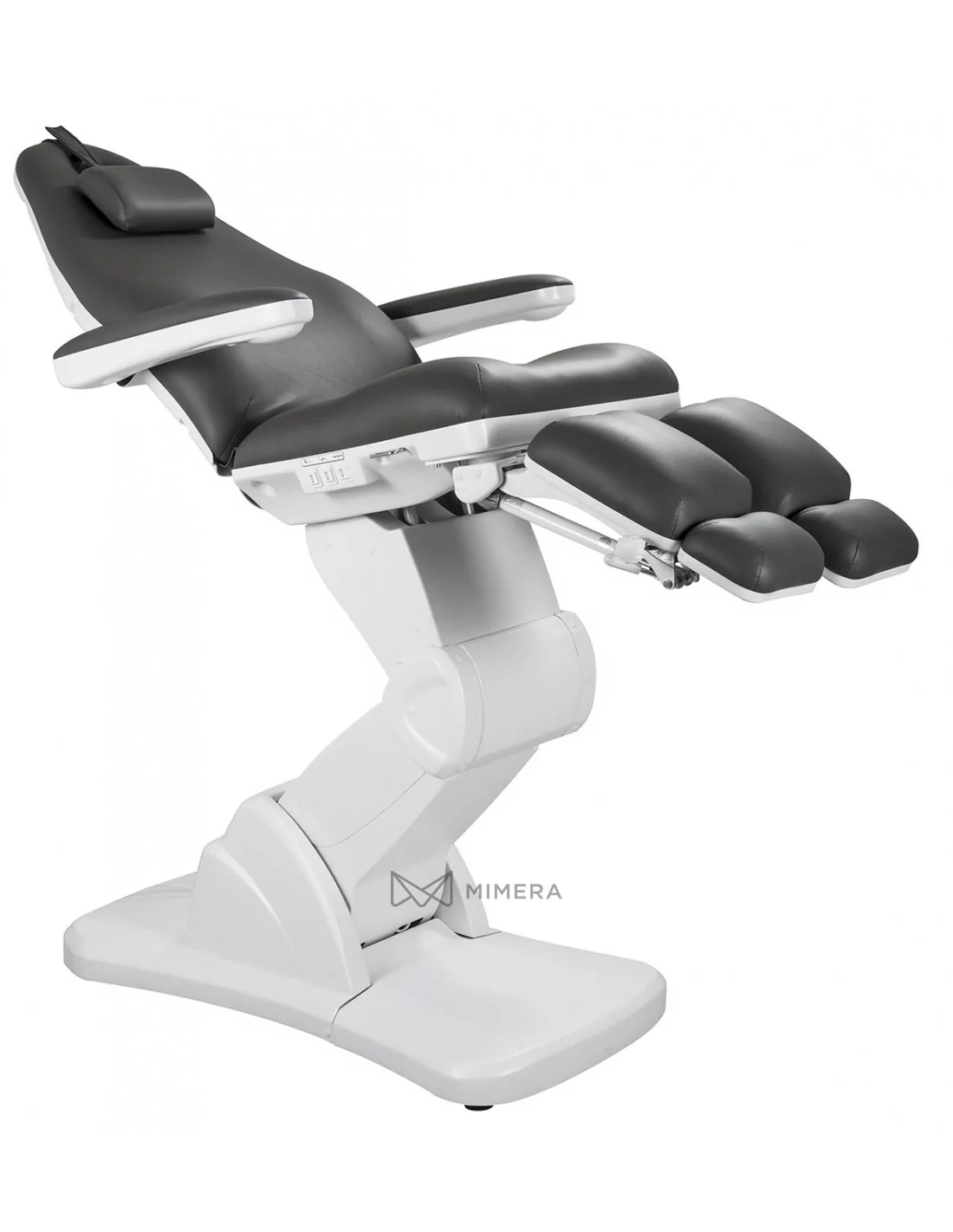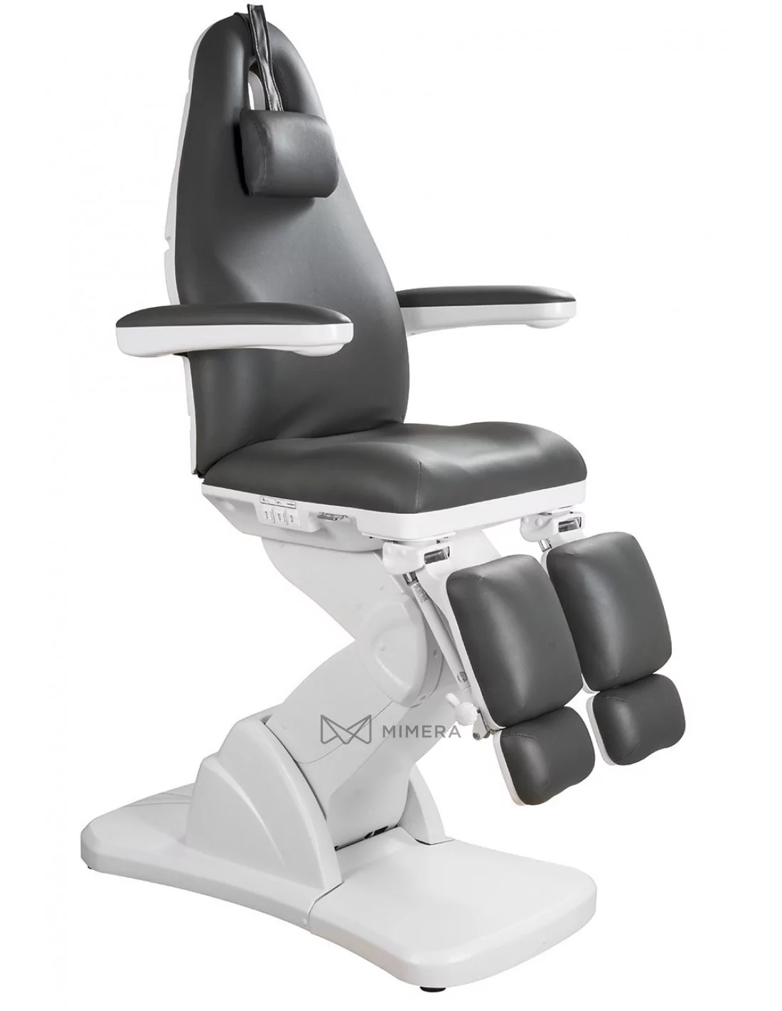 Stilvoller Fußpflegestuhl BARON mit 3 Motoren zur Einstellung von Höhe, Rückenlehne und Sitzneigung. Die Fußteile sind um 90 ° seitlich drehbar, über einen Pneumatikhebel stufenlos höhenverstellbar und auch ausziehbar.