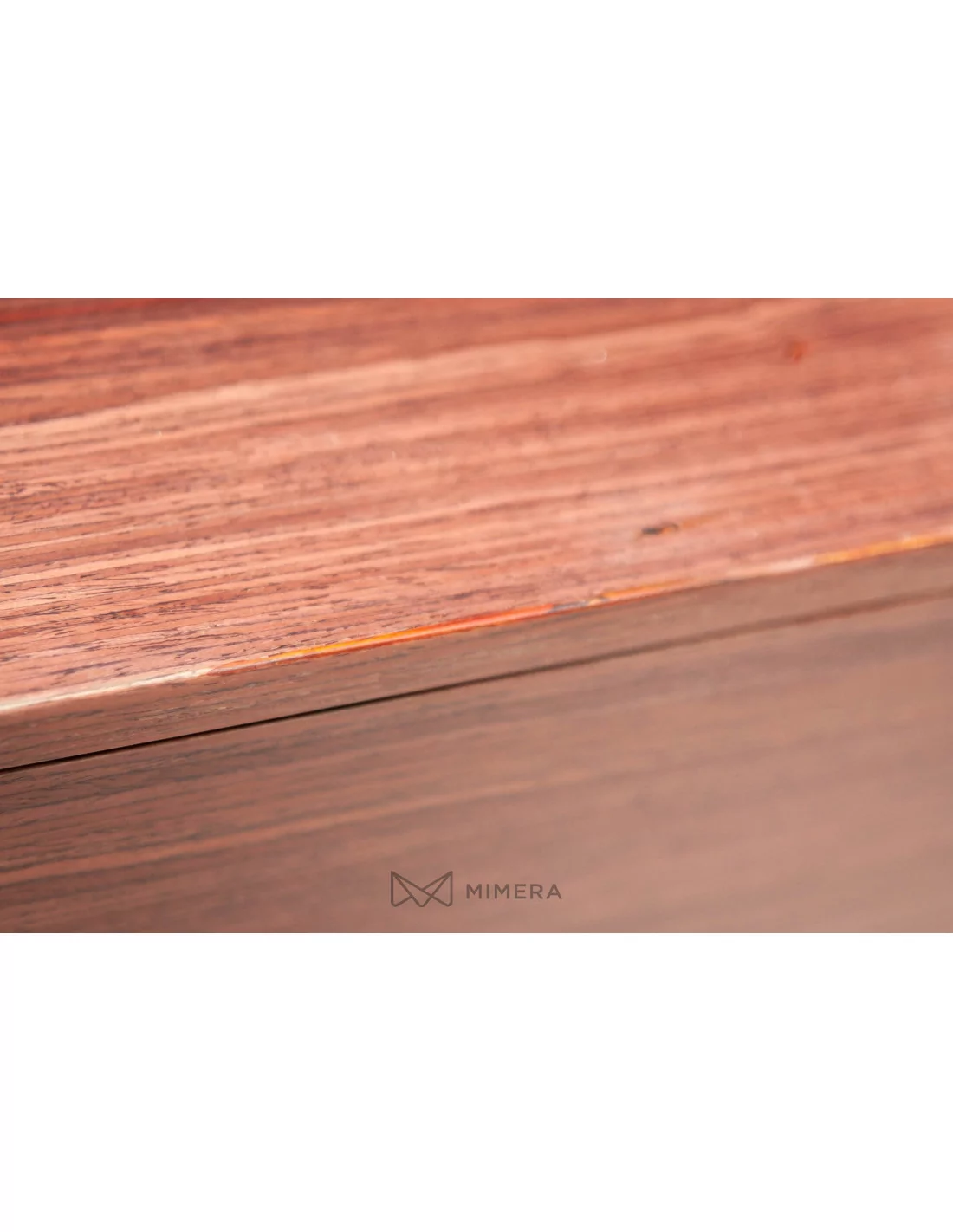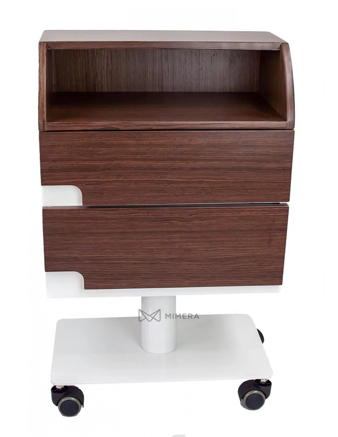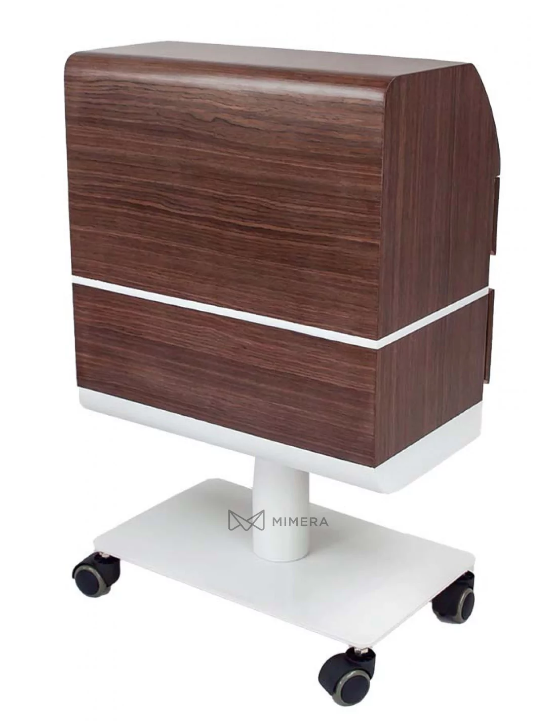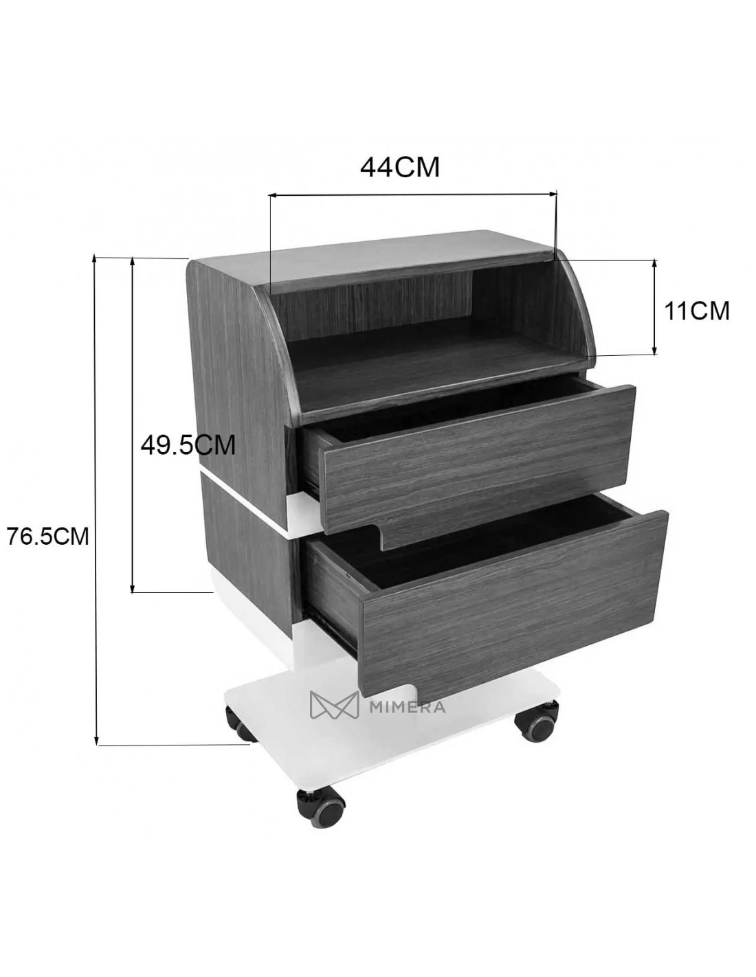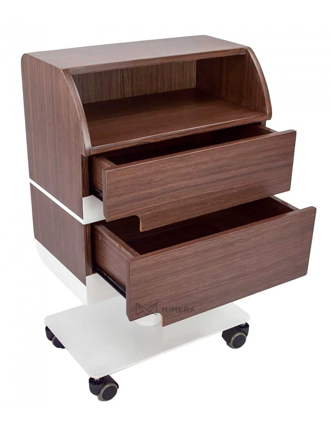 SWIFT SANDAL Kosmetiktisch mit elegantem Design und Nachahmung von Naturholz. Es ist mit einem Regal zur Aufbewahrung kosmetischer Geräte und zwei Schubladen zur Aufbewahrung kleiner Hilfsmittel ausgestattet. Der Tisch ist dank 4 Rädern voll beweglich.