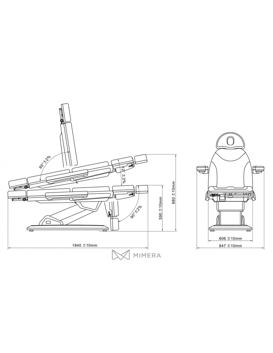 - 4 Elektromotoren zur Höhenbedienung (59~88cm), Rücklehnen (0 ~ + 85 °), Neigung der Liege (0 ~ + 12 °) und Fussteil (-90~ 0 °)