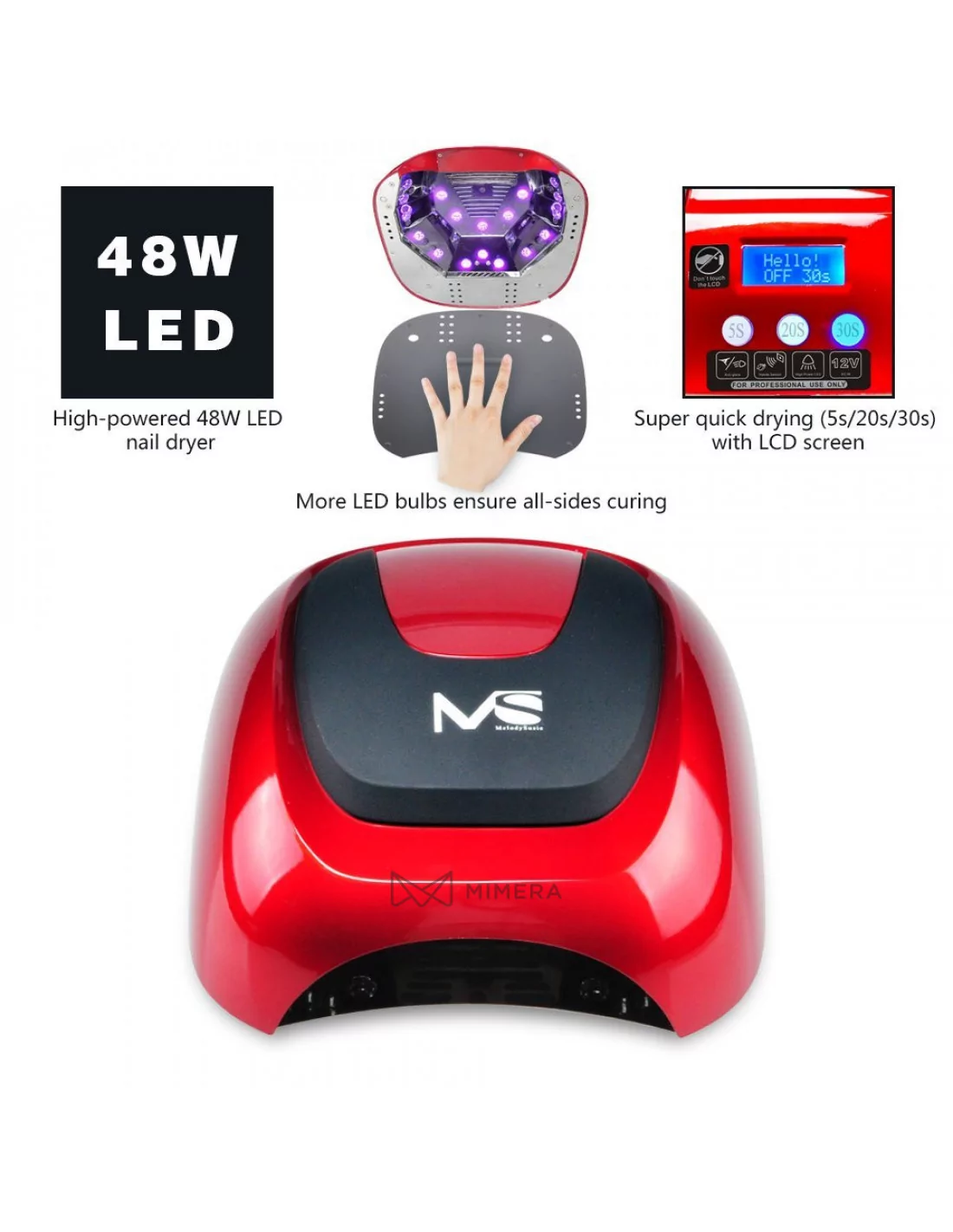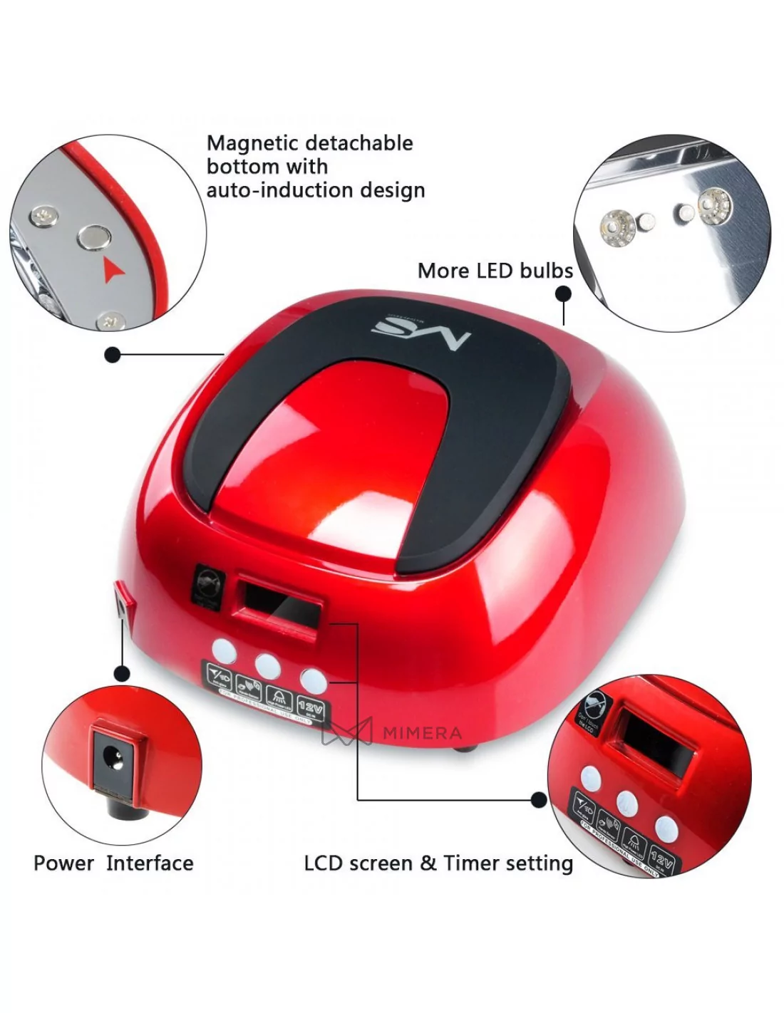 Aufgrund seiner extrem hohen Leistungsfähigkeit und den vielen Glühbirnen kann es 30.000 Stunden durchgehend in Gebrauch sein, erbringt hierbei maximale Ergebnisse und eignet sich so optimal für den professionellen Gebrauch. Seine ergonomische Form ermöglicht einen hohen Komfort für Kunden wie auch Behandler. Es verfügt über eine großzügige Innenfläche und hat trotzdem ein platzsparendes ansprechendes Außendesign. Das Gerät ist kompatibel mit fast allen LED-Gel-Lacken und überzeugt zusätzlich durch seine optimierte Timer- Funktion mit 3 voreingestellten Zeiten von 5, 20 und 30 Sekunden- dies verhindert das übermäßige Austrocknen der Nägel. Ein inkludierter Bewegungssensor schaltet den Trockner ein sobald die Hände oder Füße in dem Gerät liegen. Der abnehmbare magnetische Boden erleichtert das Trocknen sowie das Reinigen.