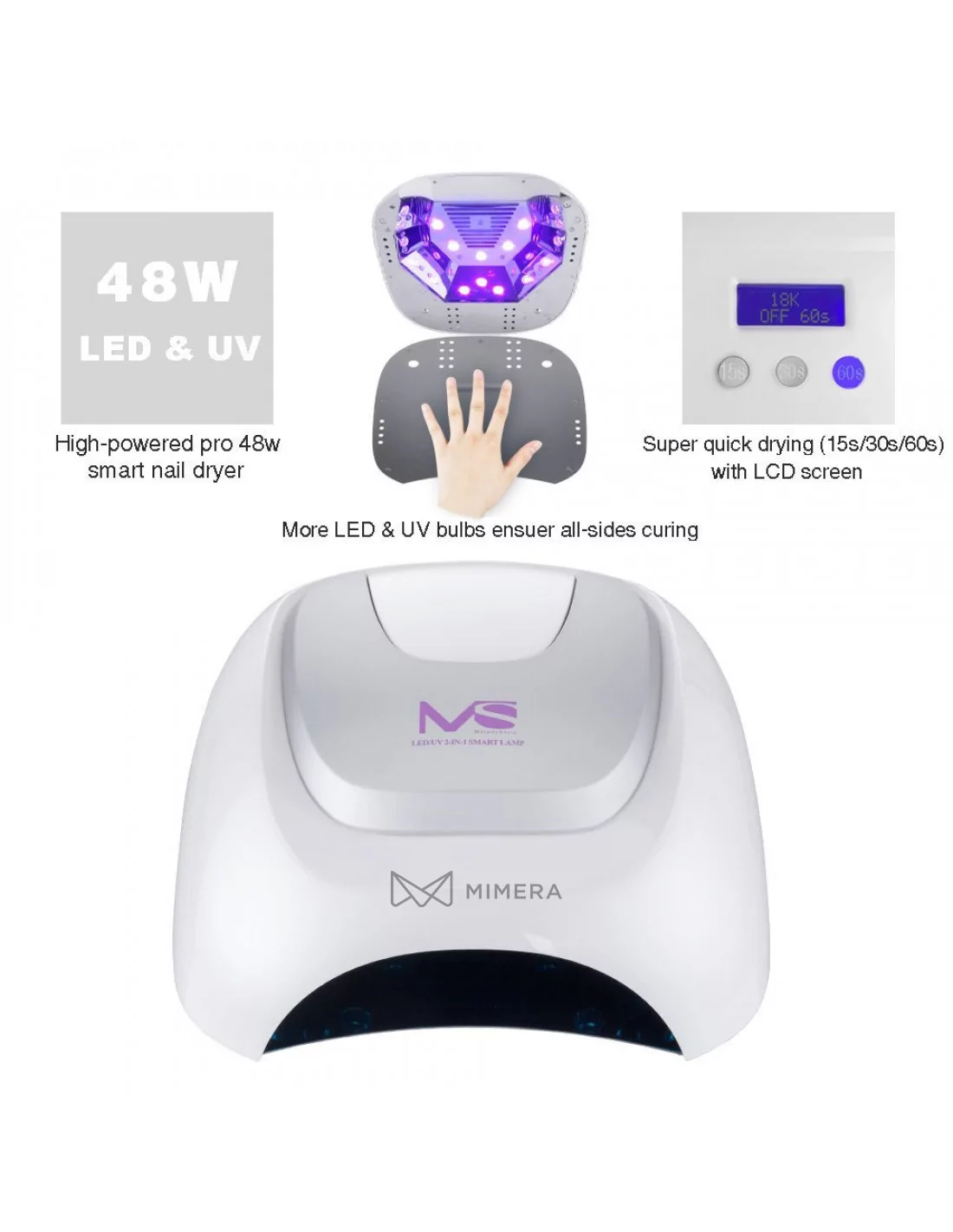 Aufgrund seiner extrem hohen Leistungsfähigkeit und den vielen Glühbirnen kann es 30.000 Stunden durchgehend in Gebrauch sein, erbringt hierbei maximale Ergebnisse und eignet sich so optimal für den professionellen Gebrauch. Seine ergonomische Form ermöglicht einen hohen Komfort für Kunden wie auch Behandler. Es verfügt über eine großzügige Innenfläche und hat trotzdem ein platzsparendes ansprechendes Außendesign. Das Gerät ist kompatibel mit fast allen LED-Gel-Lacken und überzeugt zusätzlich durch seine optimierte Timer- Funktion mit 3 voreingestellten Zeiten von 5, 20 und 30 Sekunden- dies verhindert das übermäßige Austrocknen der Nägel. Ein inkludierter Bewegungssensor schaltet den Trockner ein sobald die Hände oder Füße in dem Gerät liegen. Der abnehmbare magnetische Boden erleichtert das Trocknen sowie das Reinigen.