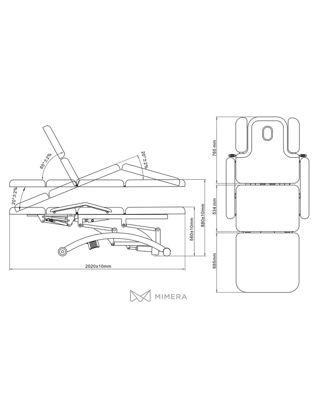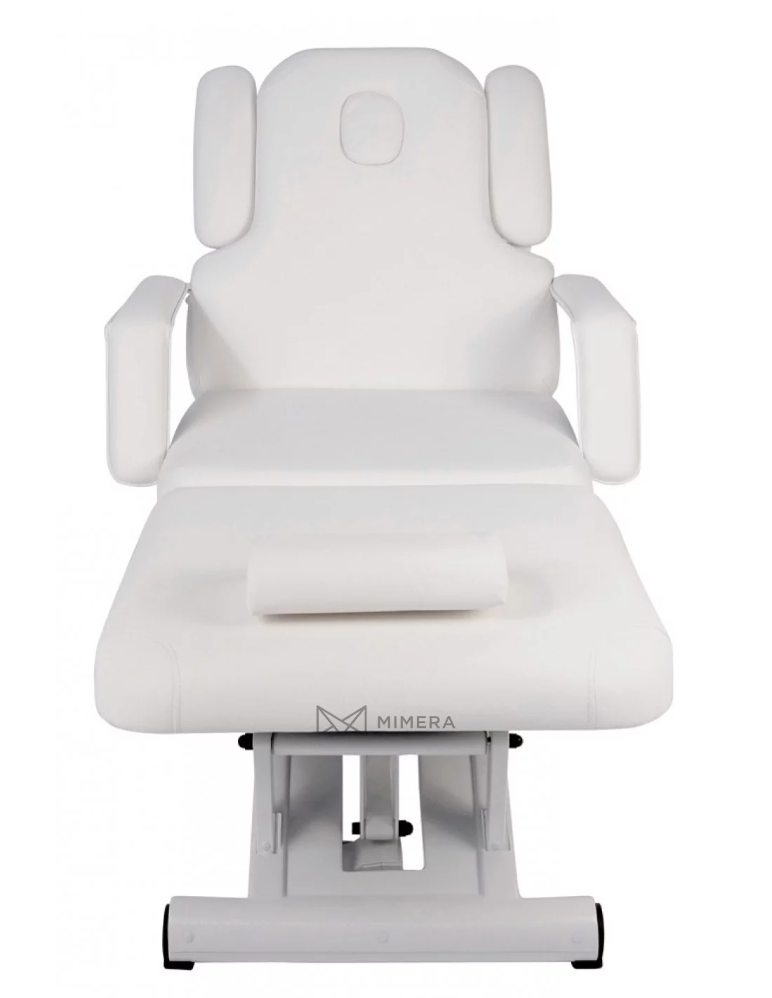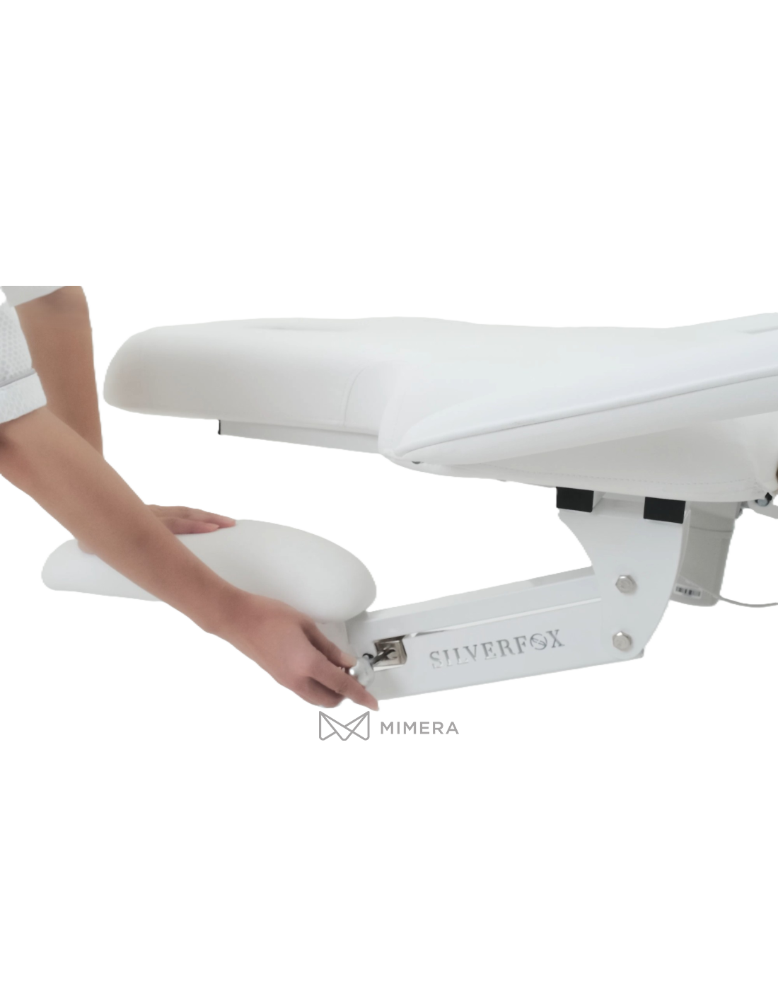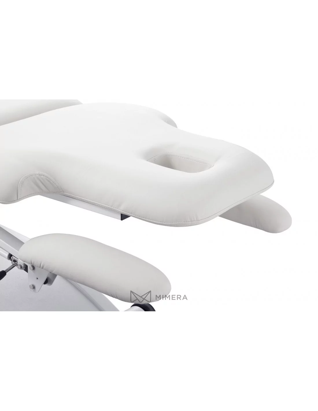 Der Stuhl verfügt über ein Doppelarmlehnensystem. Die festen, 12 cm breiten Armlehnen sind mit einem pneumatischen Hebel stufenlos verstellbar. Abnehmbare, 11 cm lange Armlehnen passen sich flexibel der Position der Liege an. Die Liege verfügt auch über eine Gesichtsöffnung, die mehrere Behandlungspositionen ermöglicht. Fußkissen für maximalen Komfort.