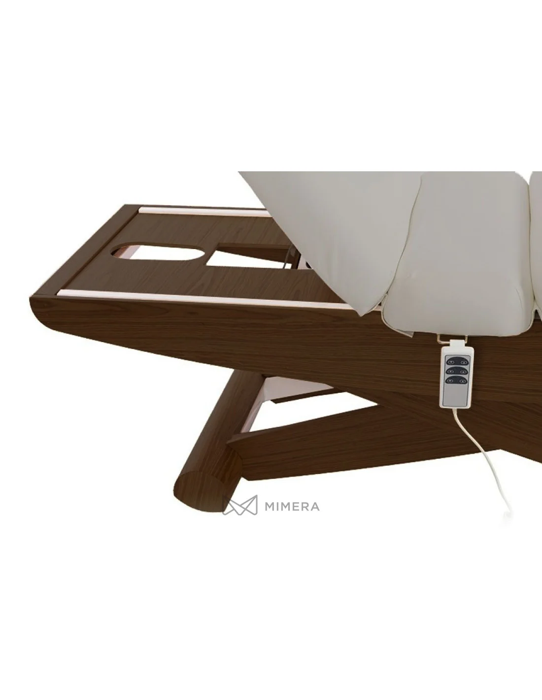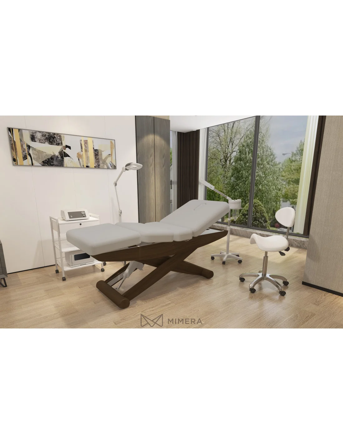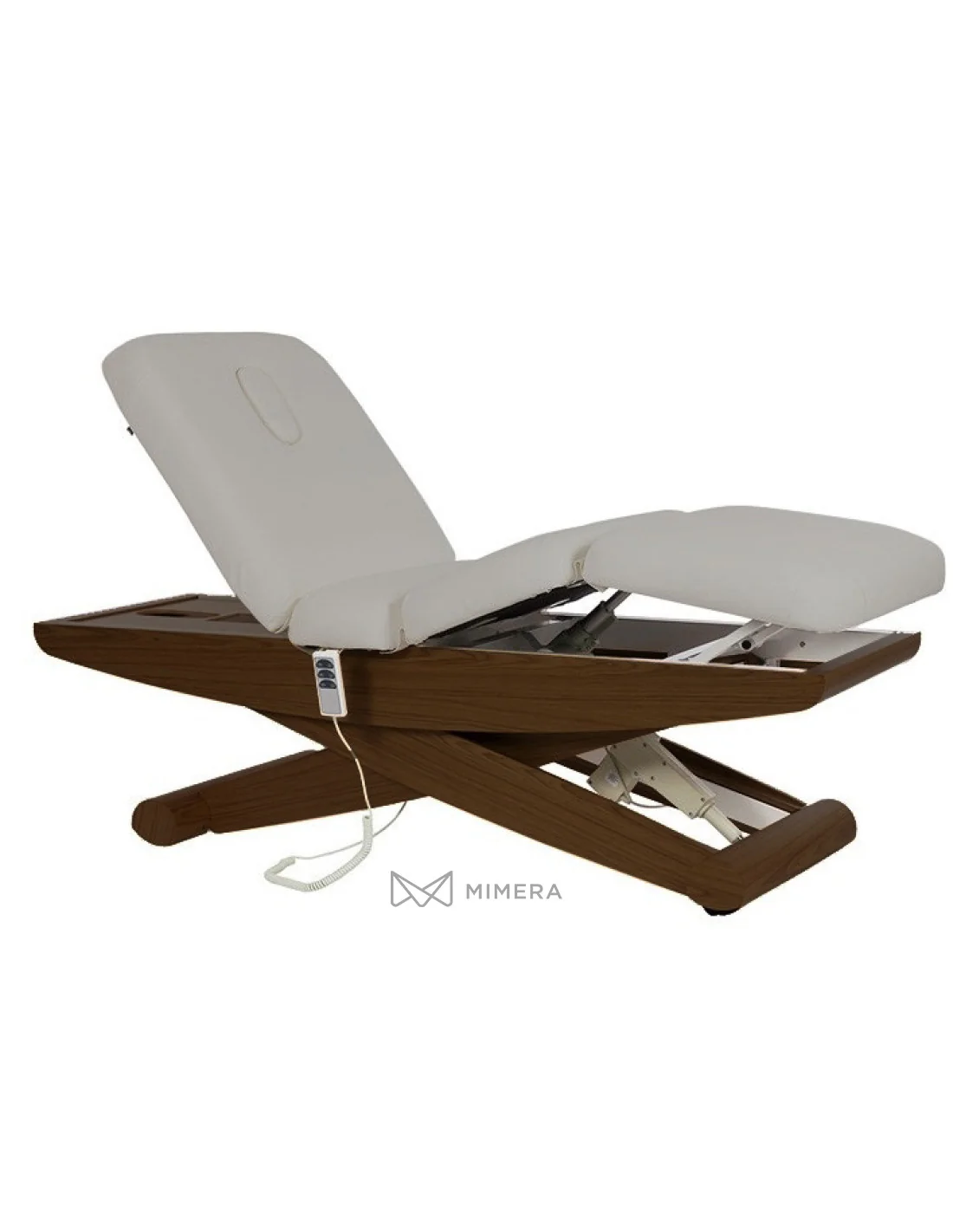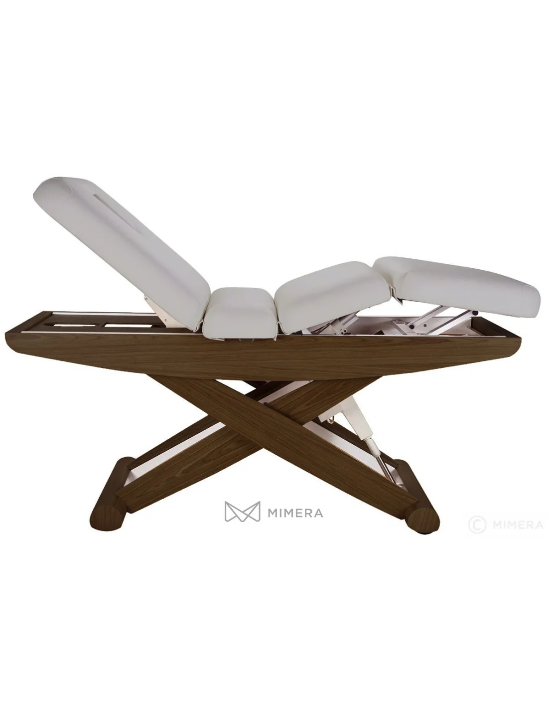 Die Liege hat eine scherenförmige Metallstruktur mit natürlicher Holzveredelung, die dem Raum eine sehr beeindruckende Wirkung verleiht. Die bequeme PU-Polsterung von höchster Qualität ermöglicht eine einfache Pflege und Wartung. Die Liege hat außerdem einen Gesichtsausschnitt.